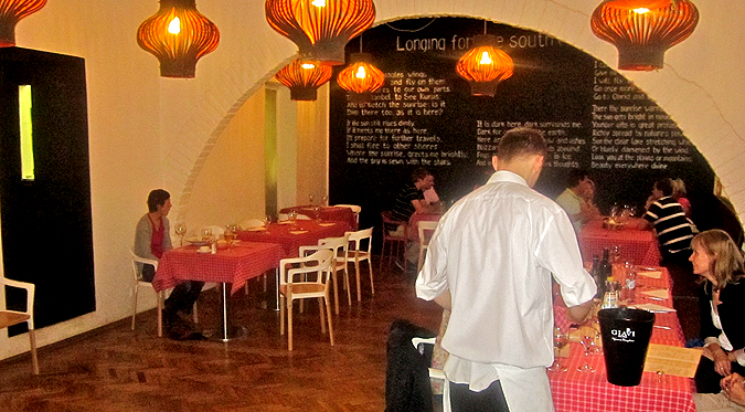 The brick arch and the black and white verses on wall are a nice touch. The poem is “Longing for the South” by Konstantin Miladinov.
