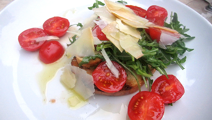 On the good bread were cherry tomato halves, rucola, shaved Parmesan, and olive oil. I was hoping for some basil. It was more like a simple little salad on toast.