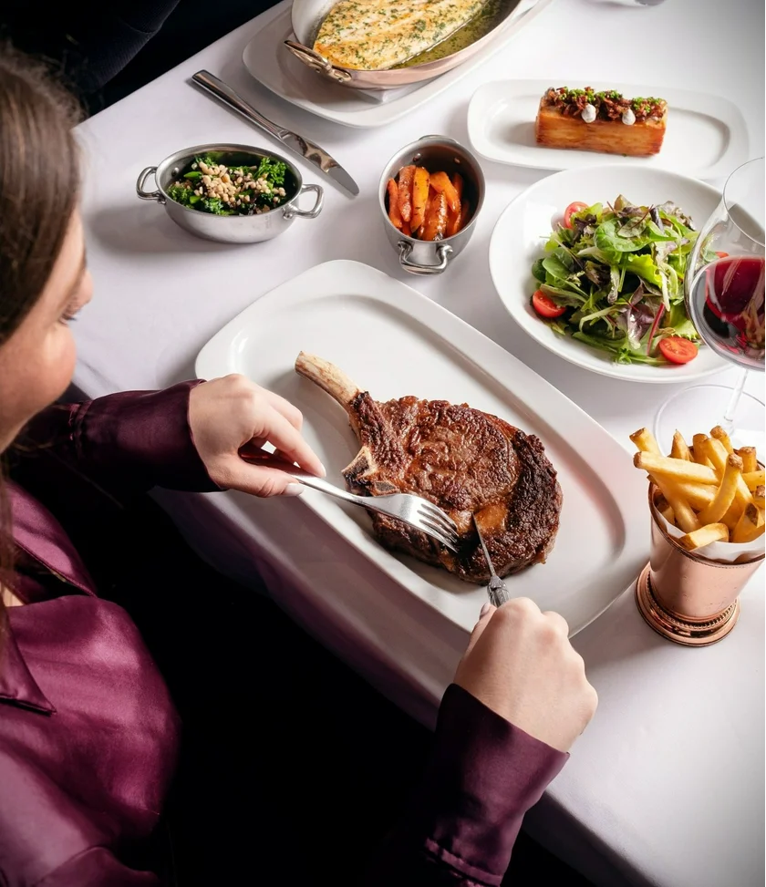 The menu is built around USDA Prime beef sourced from Midwestern farms and treated with the kind of reverence usually reserved for fine art. Steaks are aged, grilled, and served with precision, allowing the quality of the meat to speak for itself. Ribeyes arrive deeply marbled and indulgent, filets impossibly tender, New York strips bold and balanced. It’s steak for people who know exactly how good it should be. Beyond the classic cuts, the kitchen’s seafood and chef-driven entrées add balance to its offerings.