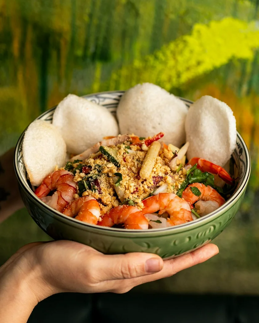 Salad is one of the areas in which Vietnamese cuisine shines, combining all the fresh and light flavors of herbs like cilantro and mint with fiery chilies. Rice Field’s salad of shrimp, lotus root, pomelo, cucumbers, carrots, grated coconut, paprika, herbs, peanuts, chili, and rice crackers is no exception.