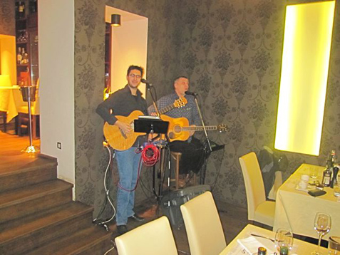 Jersey Girl, the Englishman met V and I for dinner at Porto on a Saturday night. We walked in and were greeted by two musicians I’d seen many times before around town.