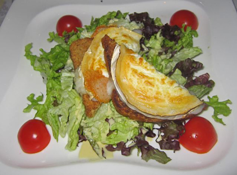 I had the bruschetta con caprino — baked goat cheese on toast with salad (150 CZK). The warm, tangy cheese was perfectly browned.