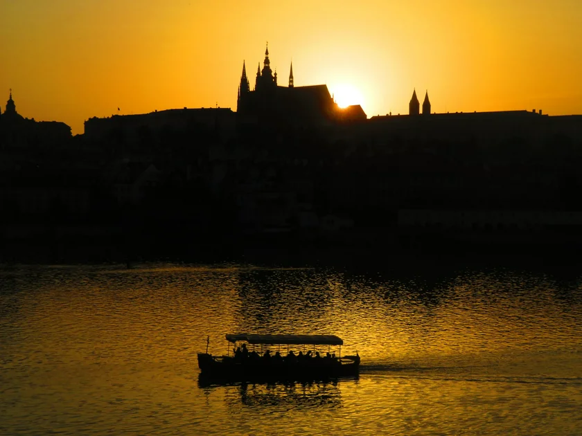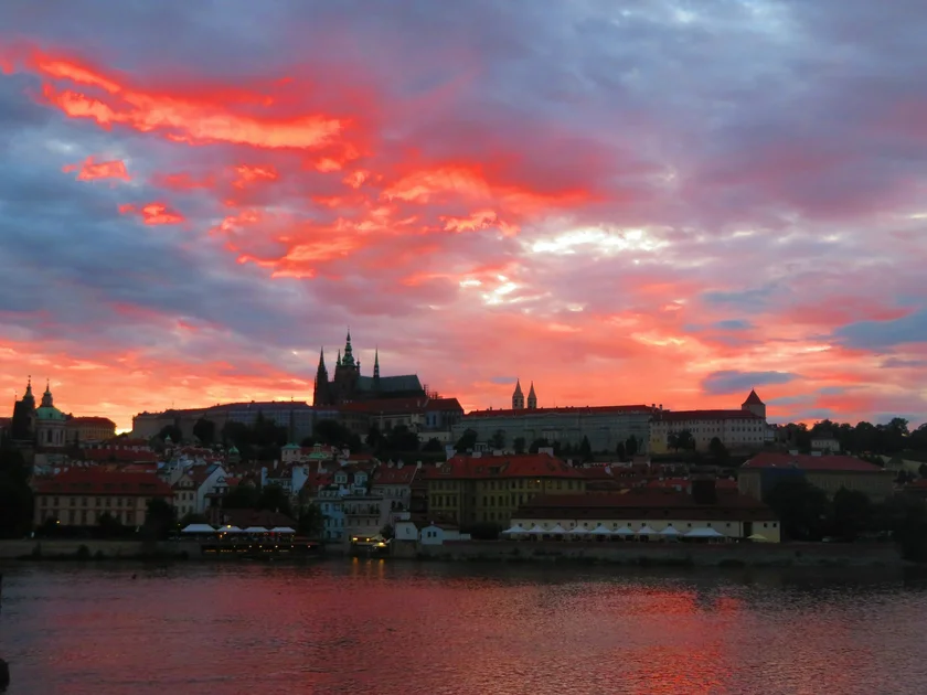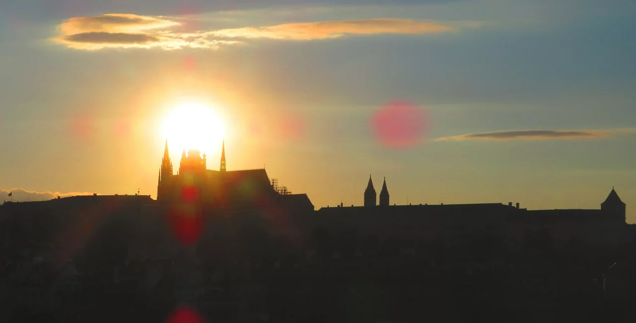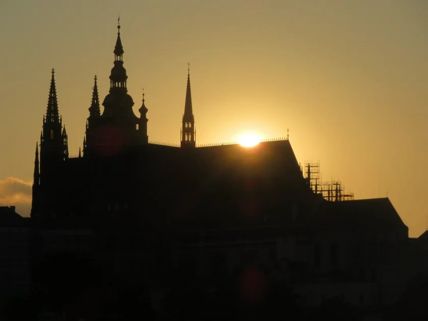 If you stand at the Old Town side of Charles Bridge and look toward Prague Castle, the sun crosses the main tower of St. Vitus’ Cathedral, lighting up the top chamber, goes past the small altar bell tower, and sets on the roof before the edge of the sun peeks out of the church’s apse and then sets a second time on the roof of the adjacent All Saints’ Church.