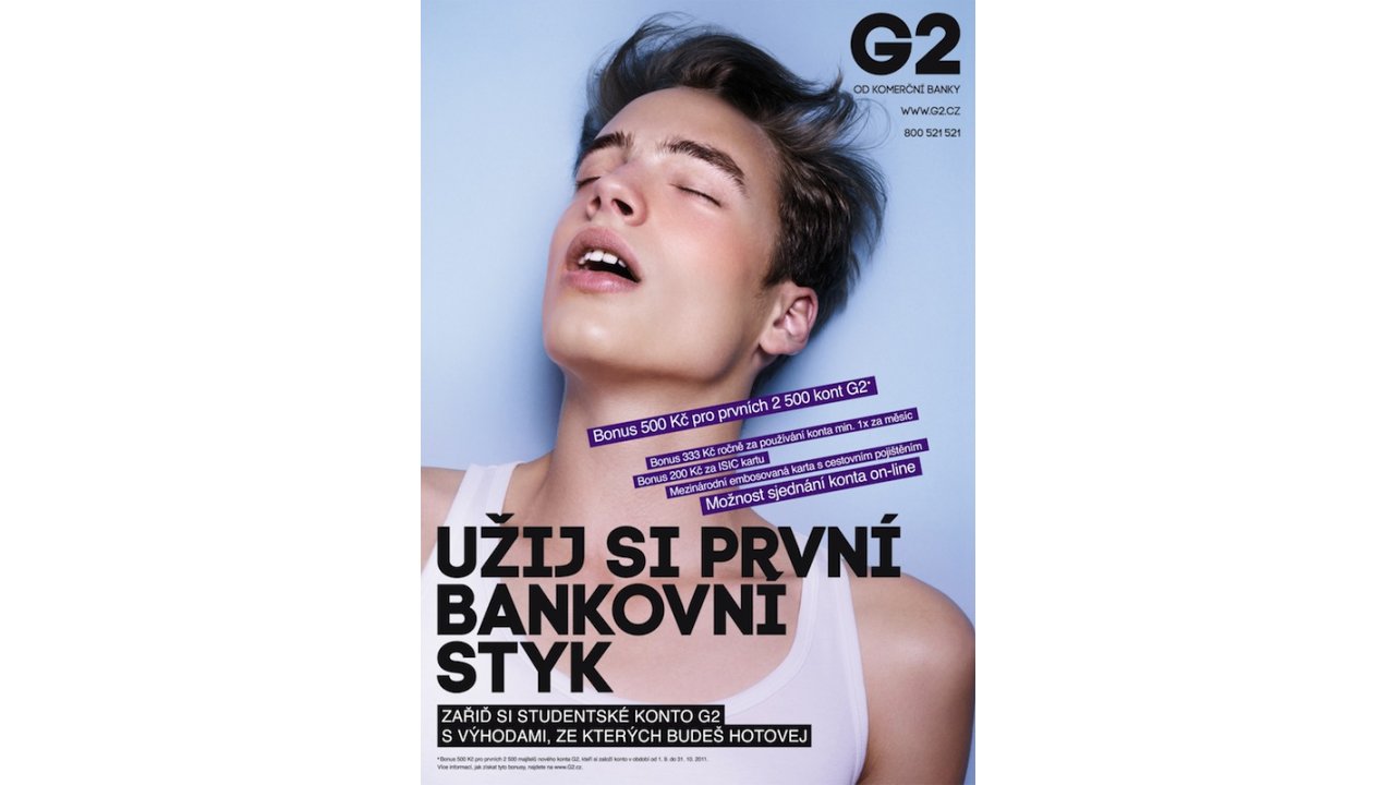 Surprisingly, perhaps, last year’s winning advert starred a man – or rather a teenage boy about to lose his virginity. Komerční banka’s 2011 campaign featured an androgynous young guy, eyes closed in orgasmic rapture, reclining next to the slogan, “Užij si první bankovní styk”: “Enjoy your first contact with the bank.”
