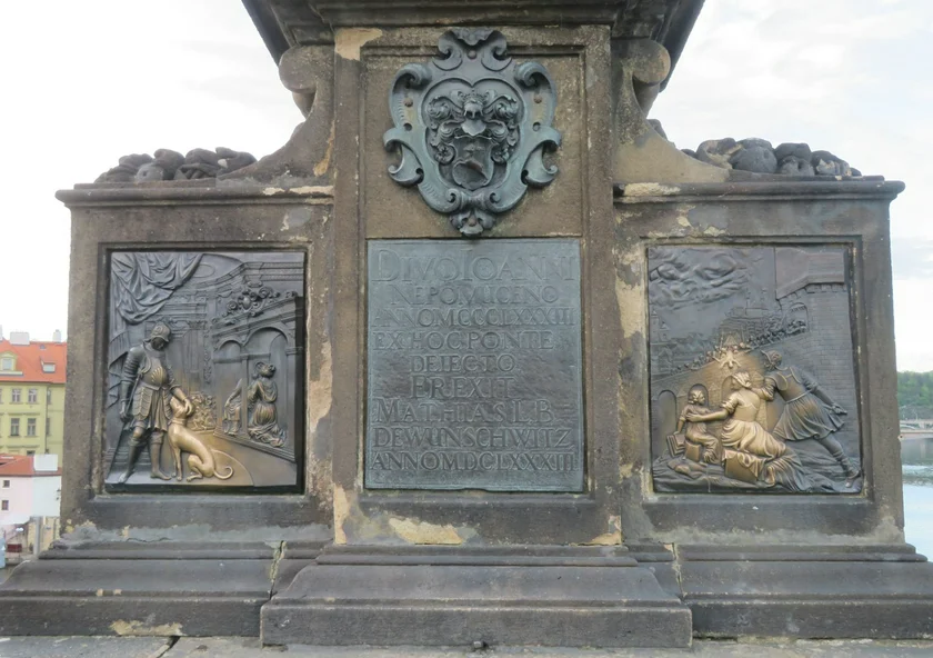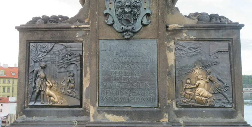 Jan Nepomucký was a priest, the vicar general of the Archbishop of Prague. The legend says he refused to tell King Wenceslas IV what Queen Žofie had confessed to him. Jan was tortured and then thrown into the Vltava river to drown, hence the image of the falling figure on the bronze plaques.