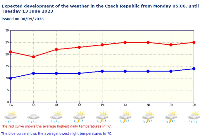 Wednesday will be warmer in Prague, with temperatures reaching about 23 degrees Celsius, and will see slightly less rain.