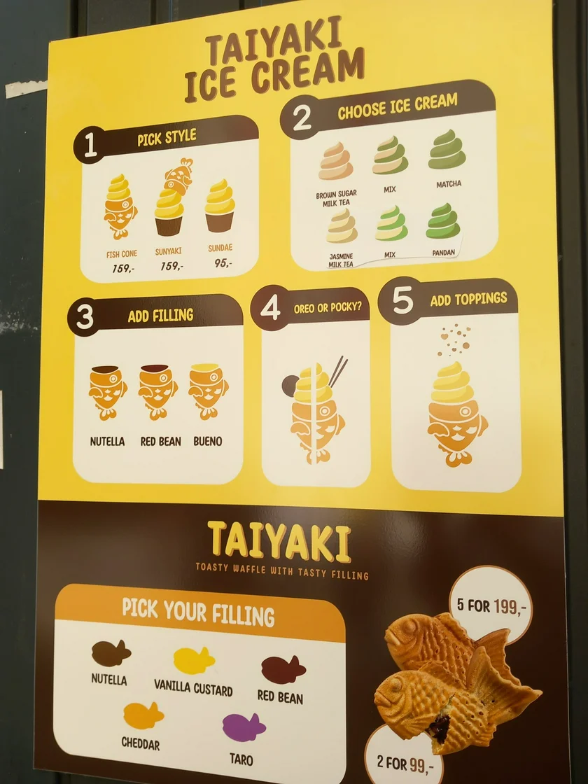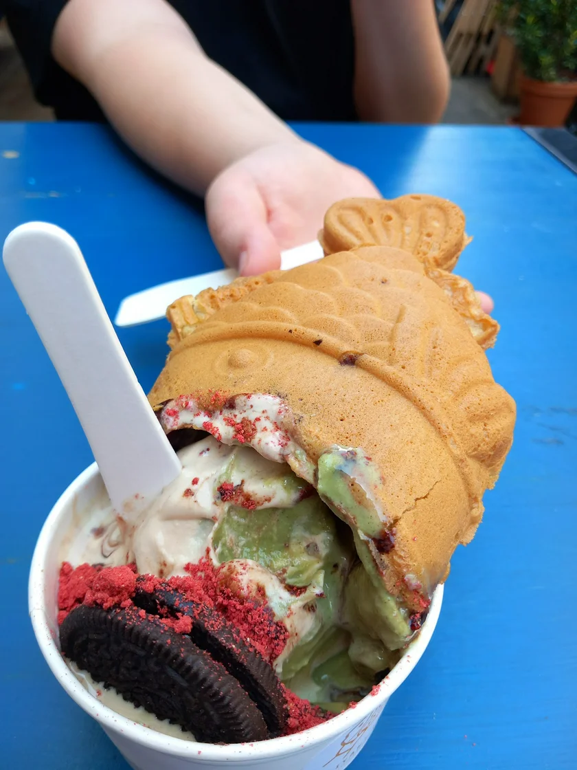 Opt for a fish cone or sunyaki style (served in a cup), or skip the fish cake altogether and just go for the sundae. You can also buy the Taiyaki on its own filled with taro, vanilla custard, Nutella, red bean paste, or savory cheddar (2 for CZK 99).