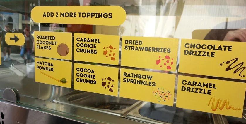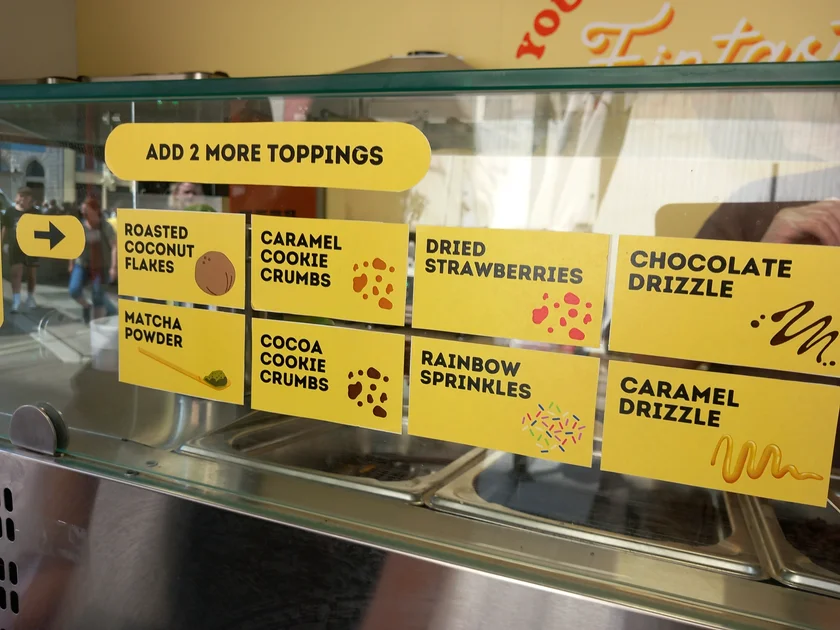 Once your flavors and fillings are selected, there's the matter of toppings which range from Pocky sticks to Oreos, dehydrated fruit, sprinkles, cinnamon-toast cereal flakes, and a drizzle of chocolate syrup. (Prices range from CZK 95-159).