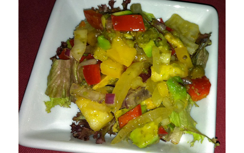 We were both happy with the salad of avocado, peppers, tomatoes, apple, onions and “Mediterranean sauce.” (65 CZK)