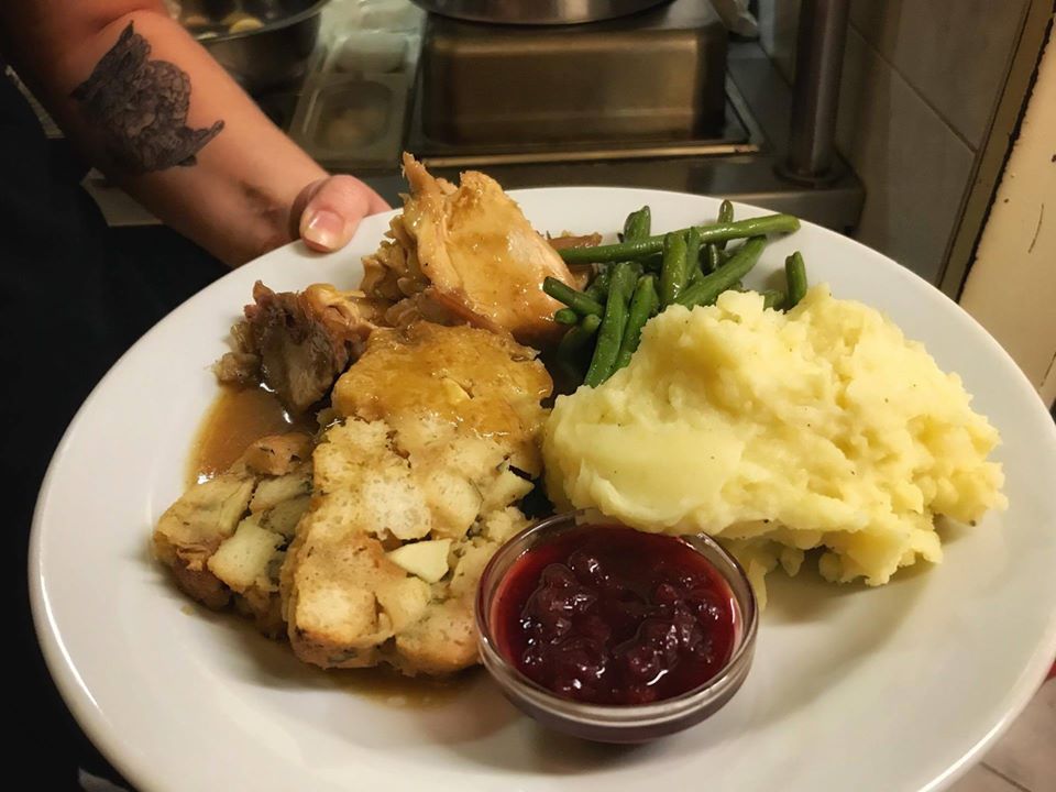 Salad appetizer, rosemary butter-rubbed turkey with mashed potatoes and gravy, green bean casserole with mushrooms, oven roasted Brussels sprouts, traditional stuffing, apple and cranberry bake, pumpkin pie with whipped cream. Vegetarian/vegan option with stuffed portobello mushrooms also available, but please request in advance.