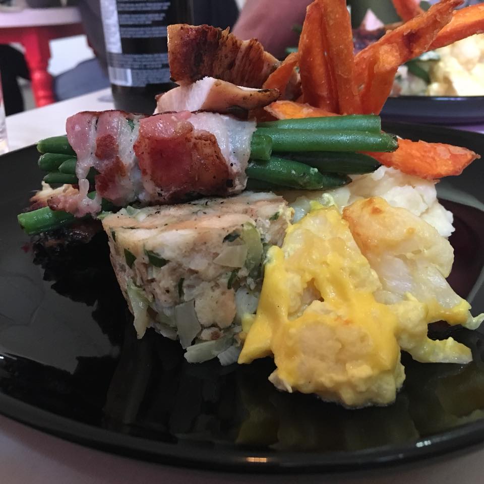 Butterball slowly roasted turkey, mashed potatoes confit garlic, sweet potatoes with homemade marshmallows, sweet corn, stuffing with homemade Mexican chorizo, gravy, homemade cranberry sauce, homemade bread, pumpkin pie cheese cake, apple pie, and salty caramel.