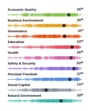 Prosperity is measured via nine pillars: economic quality, business environment, governance, personal freedom, social capital, safety and security, health and the natural environment.