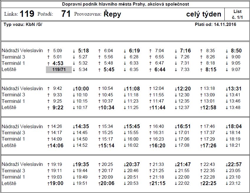 If you want to make sure you catch a ride on the longest bus in the Czech Republic, DPP uploaded its timetable on the 119 line to Twitter: