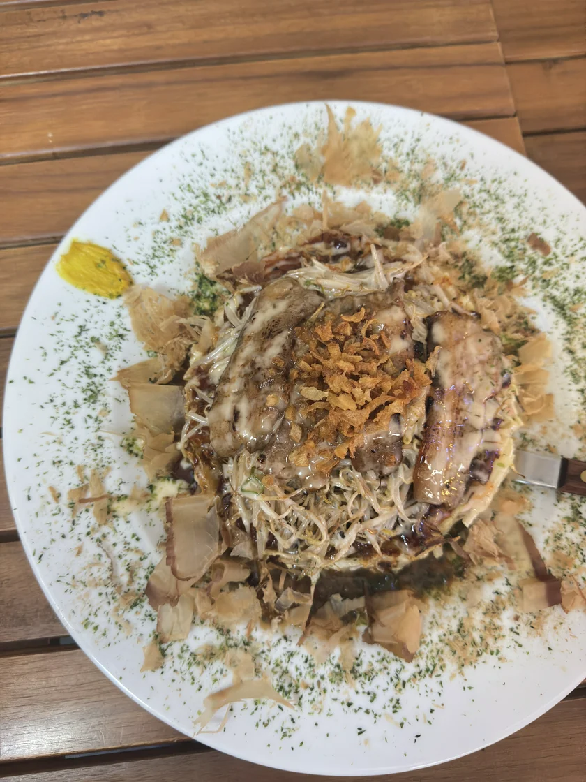 Hiroshima style okonomiyaki is notable for its star component: pork belly, which sits on top of yakisoba noodles and fried egg, and is covered in a delicious special sauce.