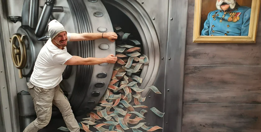 People seeking adventure can fly like a witch on a broomstick, jump out of a plane without a parachute, be carried by a dinosaur to its nest, be captured by a giant octopus, survive the Titanic, walk upside down on the ceiling of the room, or experience the torture chamber of the hangman Soapmaster. A magician can shoot you out of a cannon or levitate you. If you want, you can open the imperial vault and become a rich man – at least in a photo.