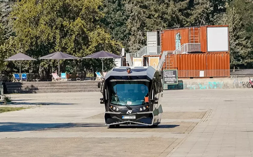 The autonomous minibus runs on a circular route within the lower section of the Exhibition Grounds, picking up and dropping off passengers by the Brussels Gate entrance to Stromovka park.