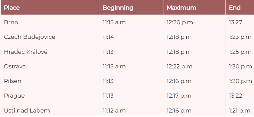 The Moon will begin to cover the Sun today at around 11:15 a.m. At the peak of the eclipse, almost one-third of the Sun will be blocked by the Moon, the Czech Hydrometeorological Institute reports.