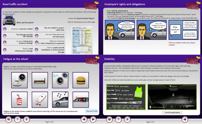 “The greatest benefits of e-learning for employees is time-saving, speed and flexibility, along with simplicity and quality,” said Pavel Greiner, chief executive and owner of Autoškola KING (KING Driving School) and the KING E-Learning portal. Besides testing, e-learning also provides information in a comprehensive interactive graphical format.