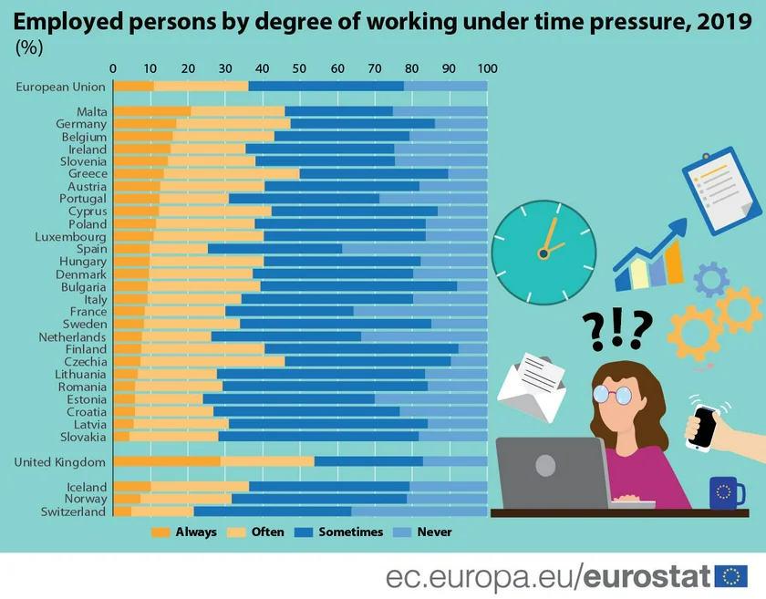 For the combined figure of always and often working under time pressure, only Greece was higher, at 47.9%. Malta came in at 46.0% and Germany at 42.0%. The United Kingdom, which is no longer part of the EU, was at 52.3%.