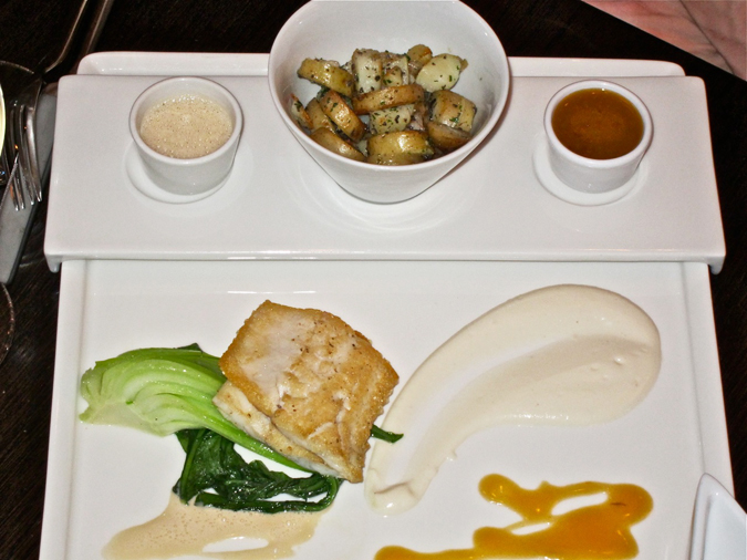 It sat on lightly crunchy wilted bok choy. Rather dull ratte potatoes had their own little bowl. The buttery sauce next to the fish tasted of cauliflower and went well with it.