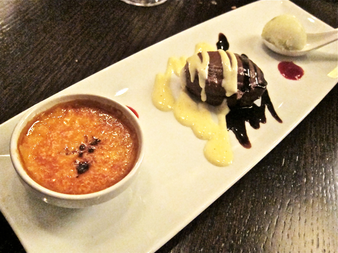 To end the meal, I ordered the dessert sampler. It consisted of a crème brûlée, a chocolate mousse, and lemon sorbet.