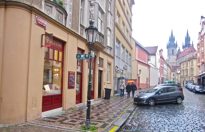 It’s right in the heart of the tourist zone, not far from Old Town Square. From the front, the spires of the Týn Church are visible over the rooftops.