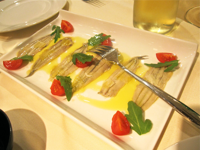 For starters, we decided to have the “Fantasie di Mare” antipasti for two (590 CZK). The anchovies in the first round were basic but nice — lemony, with good olive oil and excellent cherry tomatoes.