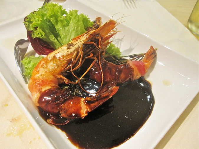 The last fantasy round feature two big shrimp, expertly grilled with their heads on. They were wrapped in pancetta and sat on a syrupy sweet sauce, which I think was a balsamic reduction.