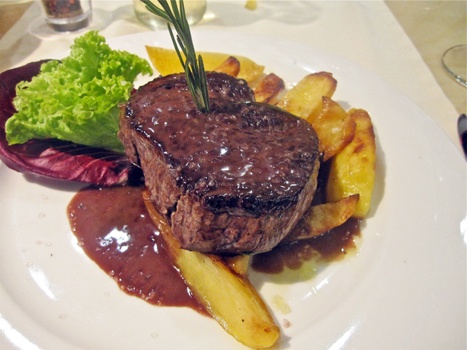 It was cooked to order, medium rare, and the meat had good flavor. The cut was firm and not very tender and on the chewy side, so there was a little disappointment. The wine lent the sauce an assertive tartness. I very much liked the potatoes seasoned with rosemary.