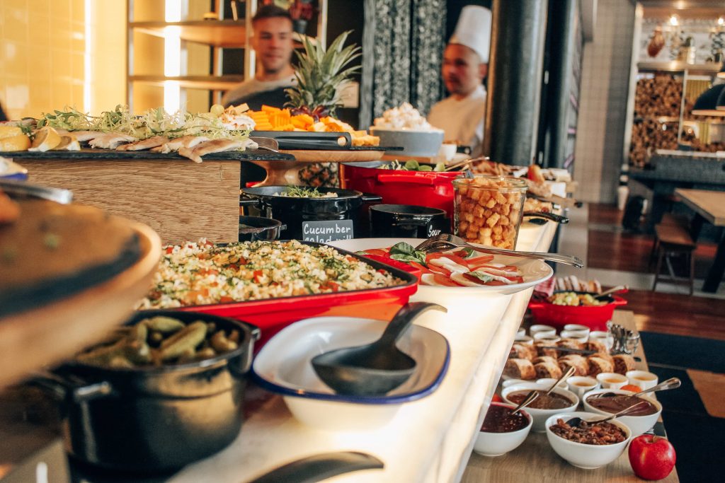 The buffet-style brunch is definitely not your standard Continental breakfast fare. The spread runs the spectrum from vegetarian quiche, cheeses, grain and vegetable salads, charcuterie, and a rainbow of fresh fruit, to breakfast casseroles served family-style in enormous baking dishes.