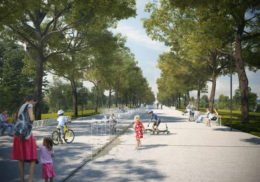 The plan calls for significant modifications to the park in Prague’s Žižkov district. The promenade leading to the National Monument and Žižka statue should acquire a significantly more residential character. It is currently a road with two sidewalks. That should change when the road is abolished and a 14-meter-wide pedestrian with sprinklers is created, ending in a plaza with a fountain.