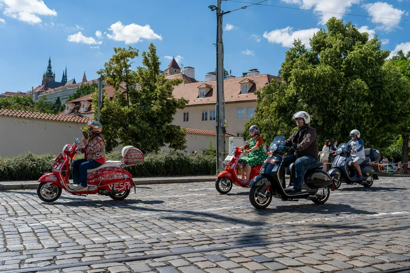 On Saturday morning, 419 Vespa and Piaggio vehicles, mostly from Italy, rode through Prague as part of the 12th PragoVespa meeting organized by the Vespa Club Prague and the Vespa representative office in the Czech Republic. According to event spokeswoman Andrea Kloučková, this year's turnout was slightly lower than last year's.
