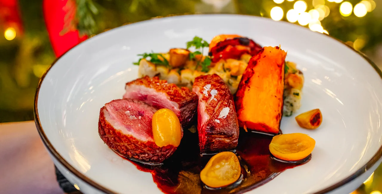Červený Jelen's festive menu runs from Dec. 24-26 with a special Christmas menu offered on Dec. 25 and 26. The à la carte menu includes fish soup, barley risotto with dried mushrooms, pike-perch with Riesling sauce and gratin potatoes, veal tenderloin, and salsiccia with black truffle and potato salad. End on a sweet note with Kaiserschmarrn, beer cake, pecan square, or plum crumble. A special three-course Christmas menu features Magret duck breast with roasted Hokkaido squash, chestnut stuffing, mulled wine sauce, and gingerbread cake. Make your reservation here.