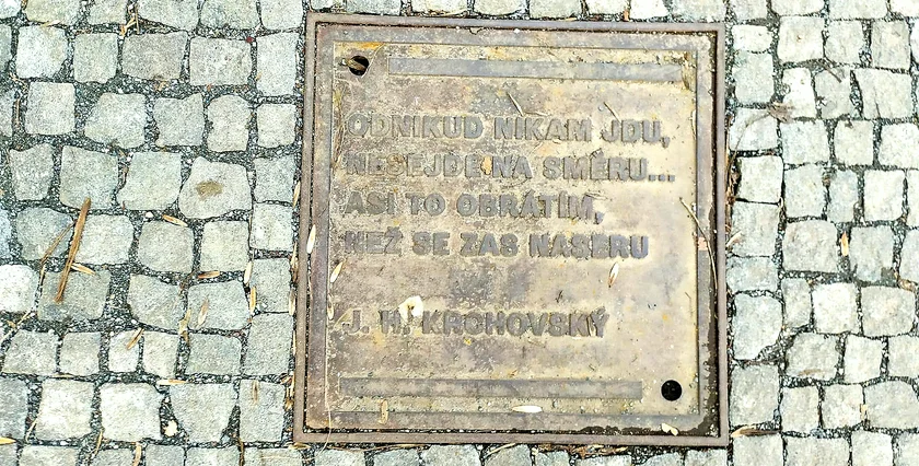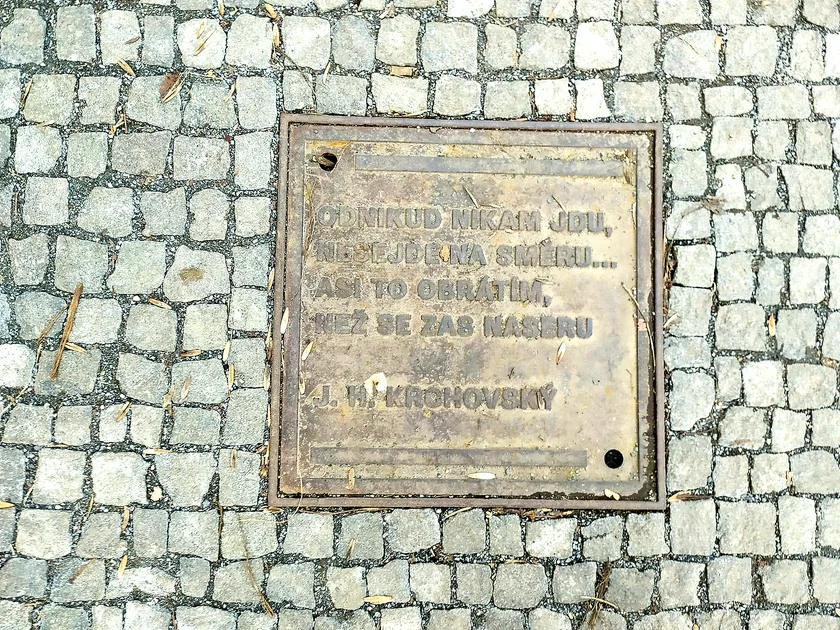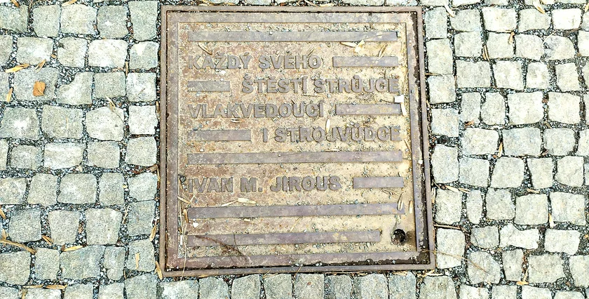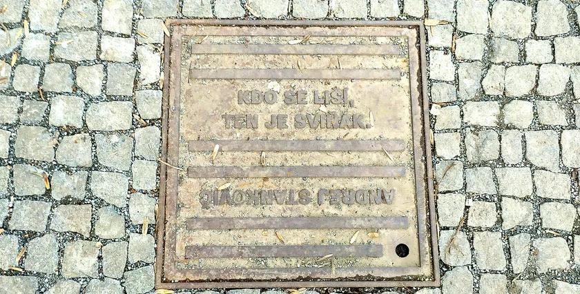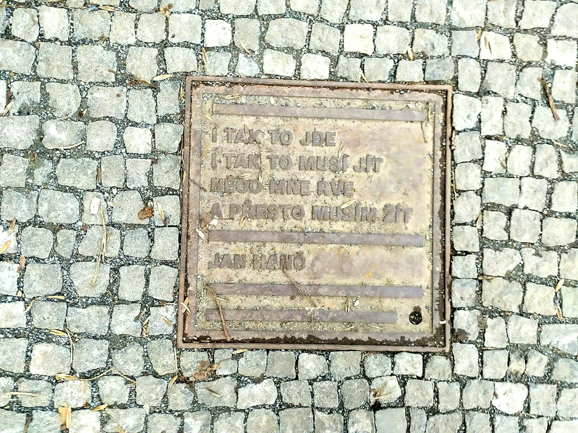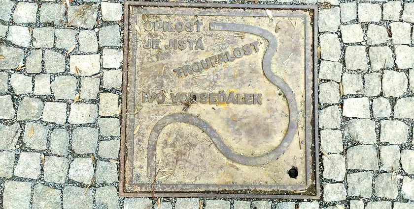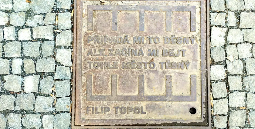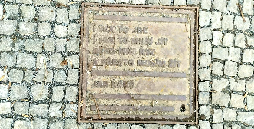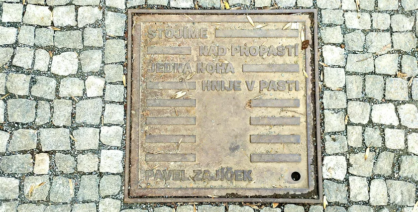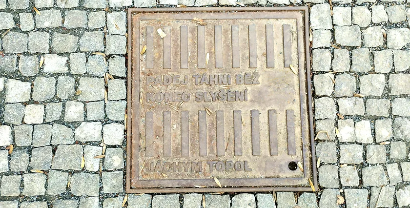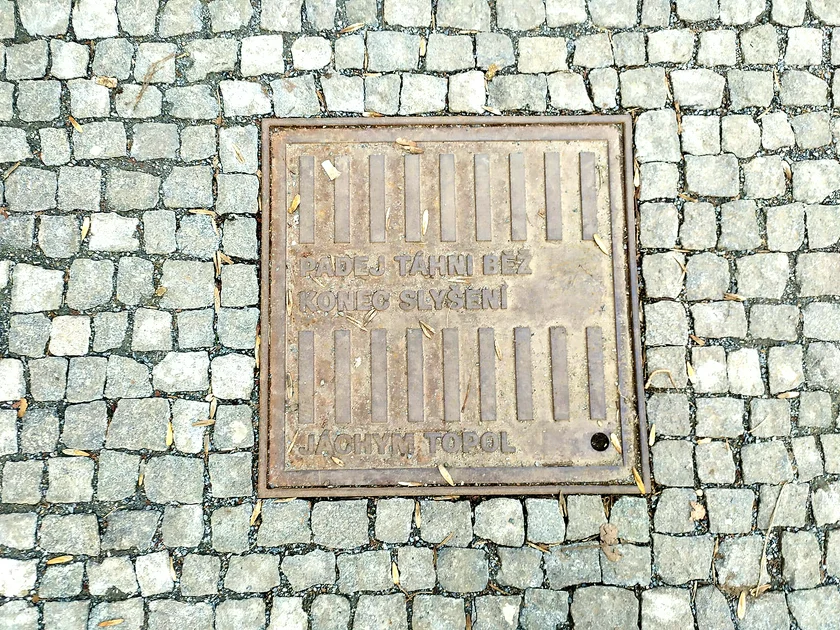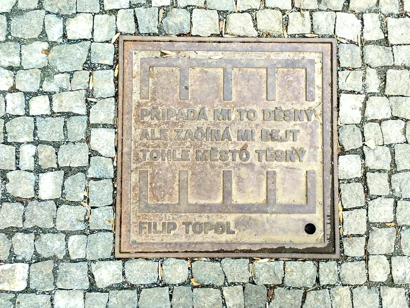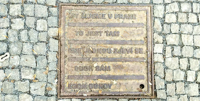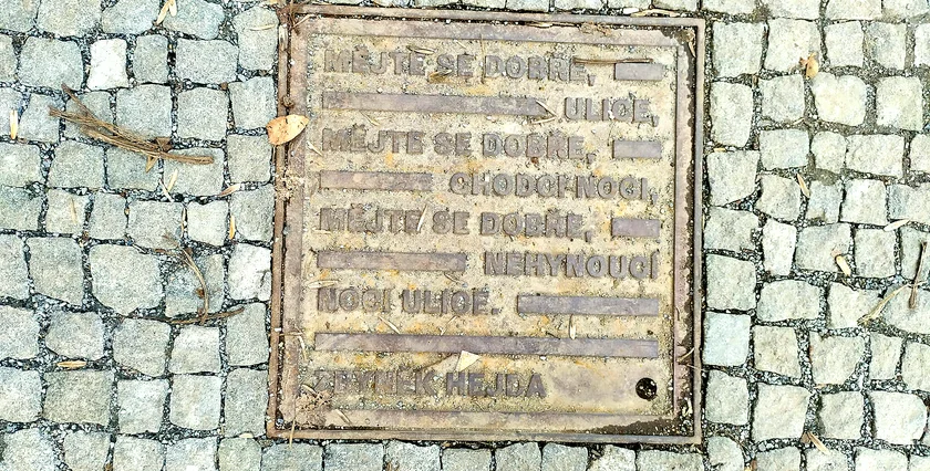 People seldom stop to read the text on manhole covers. A series of cast iron covers on Prague’s Kampa island seeks to capture your attention. The metal covers look back to the Czechoslovak underground art scene in the communist era. The work is a broad visual pun playing on the concept of underground art, and manhole covers that would actually lead under the ground.