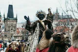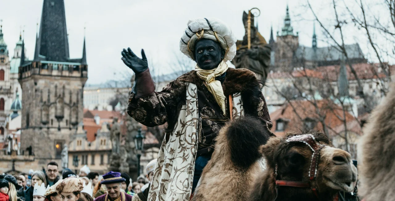 By tradition, one of the Three Kings is depicted as black, and for years the parade in Prague has used a person in dark makeup.