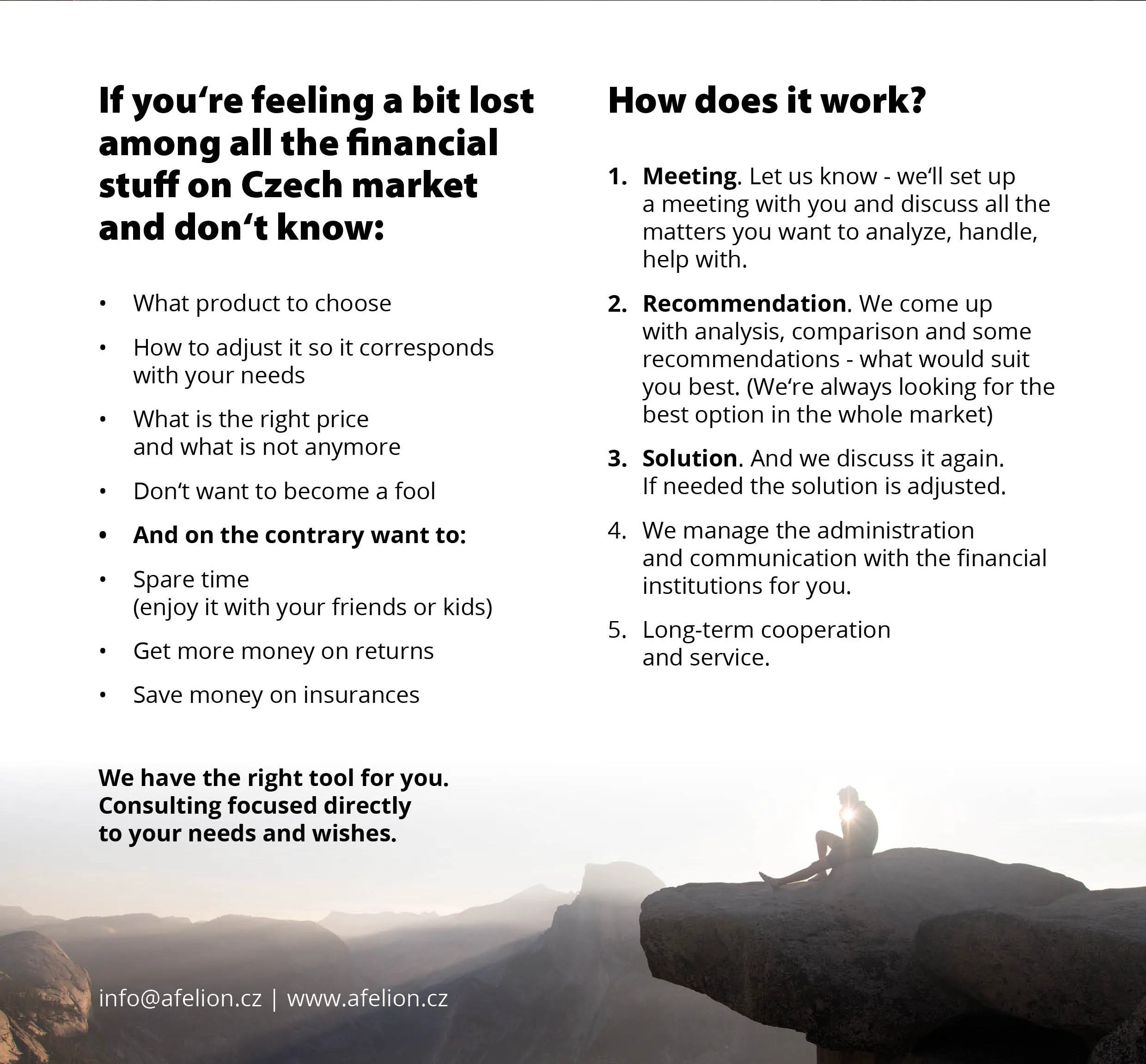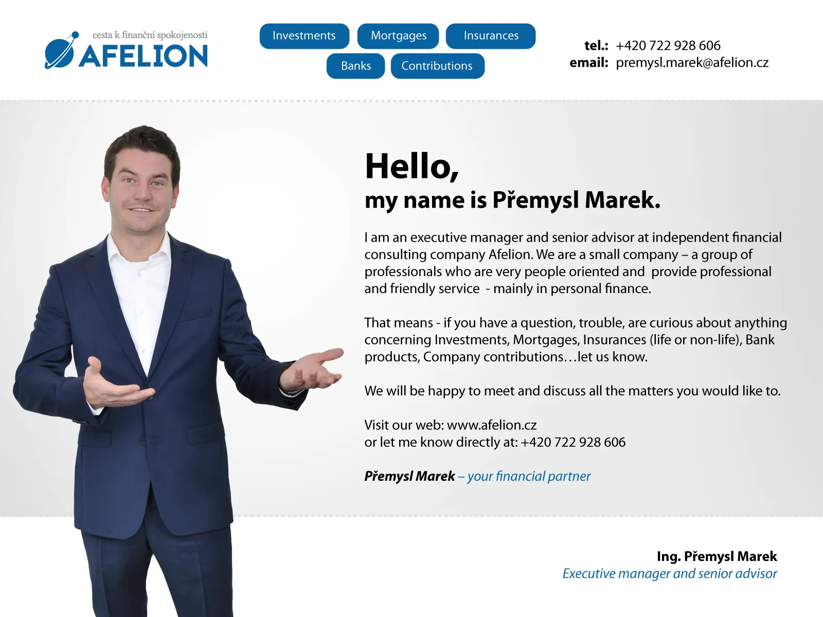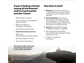 We are not just some international corporation - we are a group of independent financial advisors with economical and financial education, long career in finances and broad knowledge of Czech financial market.