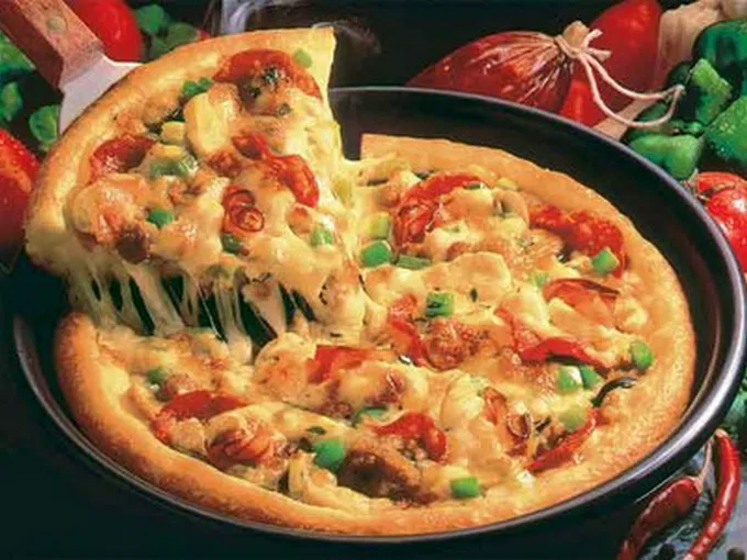 Pizza  is an oven-baked, flat, disc shaped bread usually topped with tomato sauce and mozzarella and then a selection of meats, salamis, seafood, cheeses, vegetables and herbs depending on taste and culture.