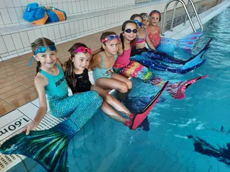 With children we swimm from the age of 4. Children will learn basic swimming skills in groups STARFISH, CRABS, SEAHORSES and then smoothly master their first strokes in groups TURTLES, PINGUINS and DOLPHINS. We are also prepared for lessons with competitive swimmers in group ATHLETES, during which we focus on perfect mastery of swimming techniques. Last but not least, we turn kids into mermaids and dolphins, in MERMAIDING lessons.