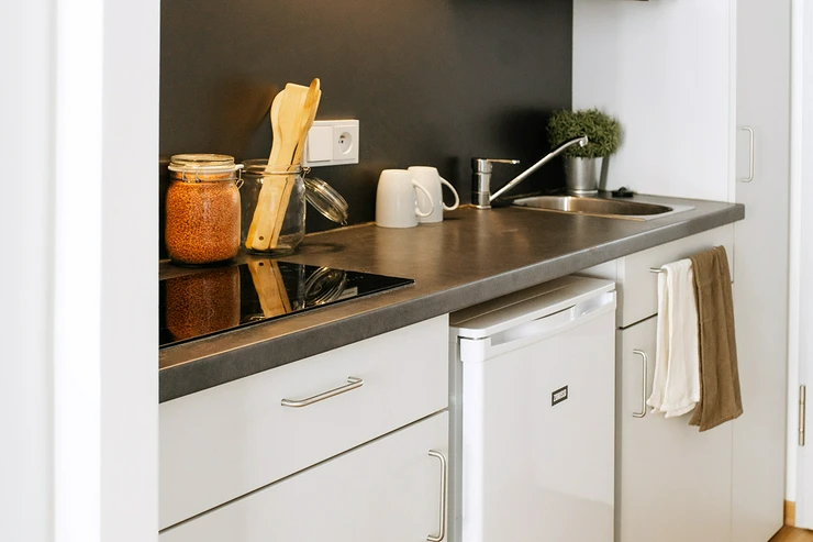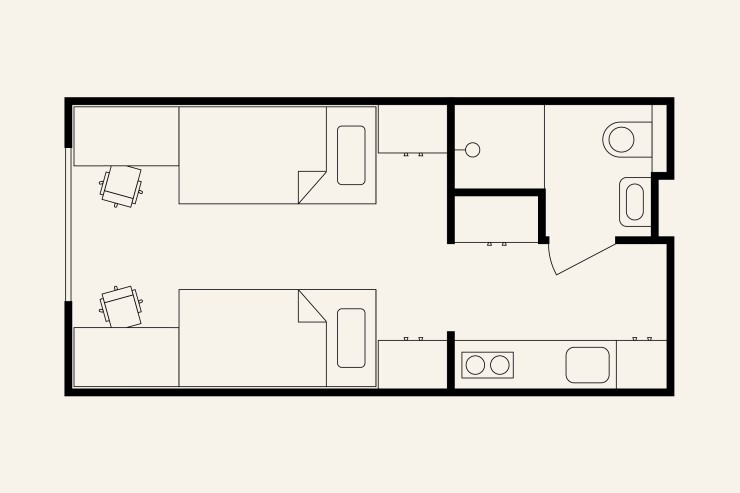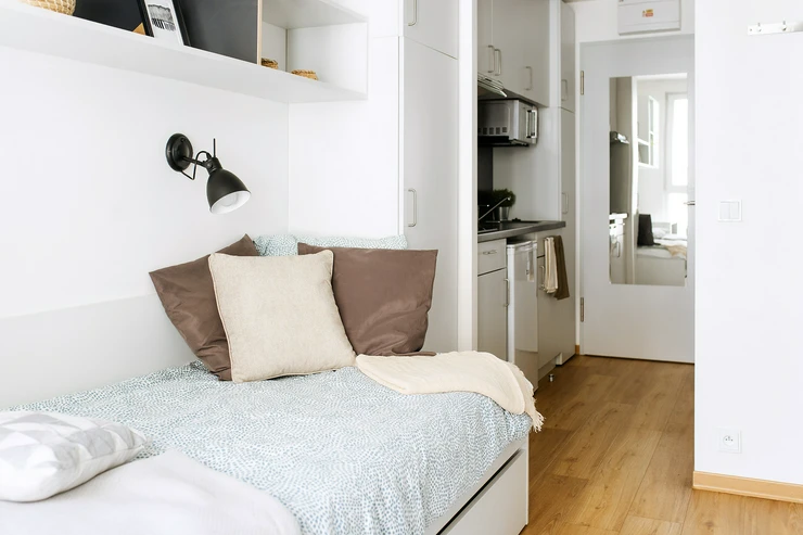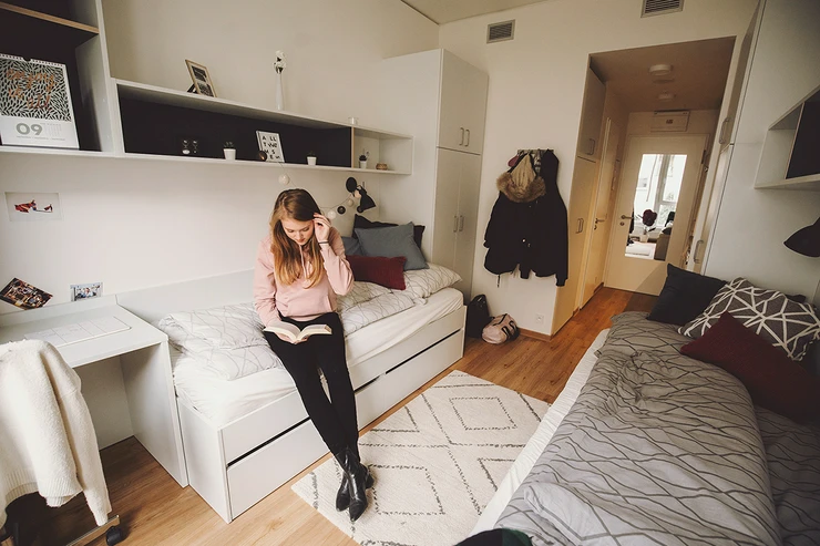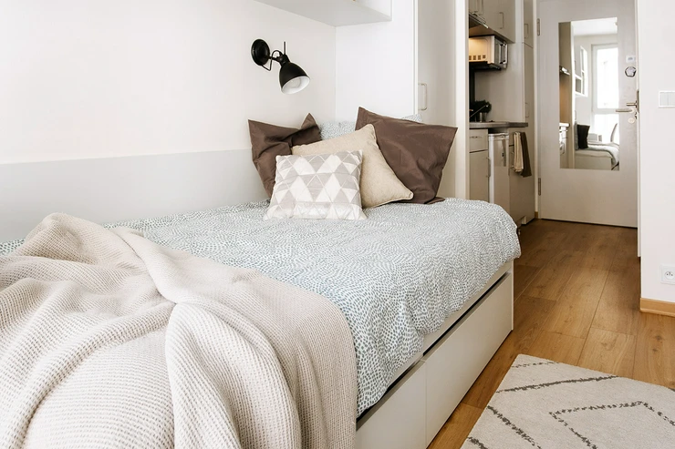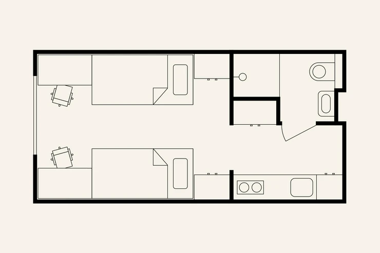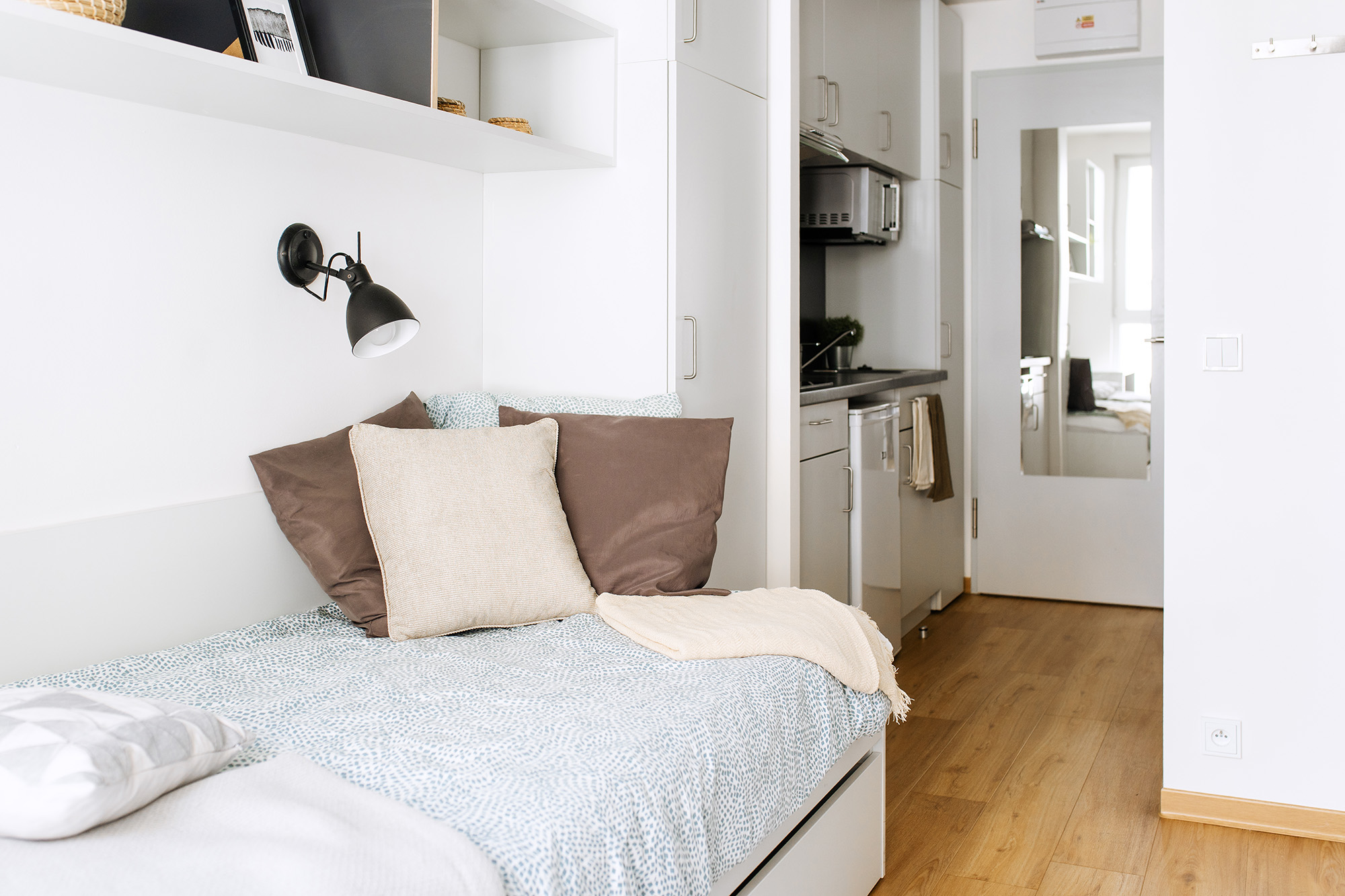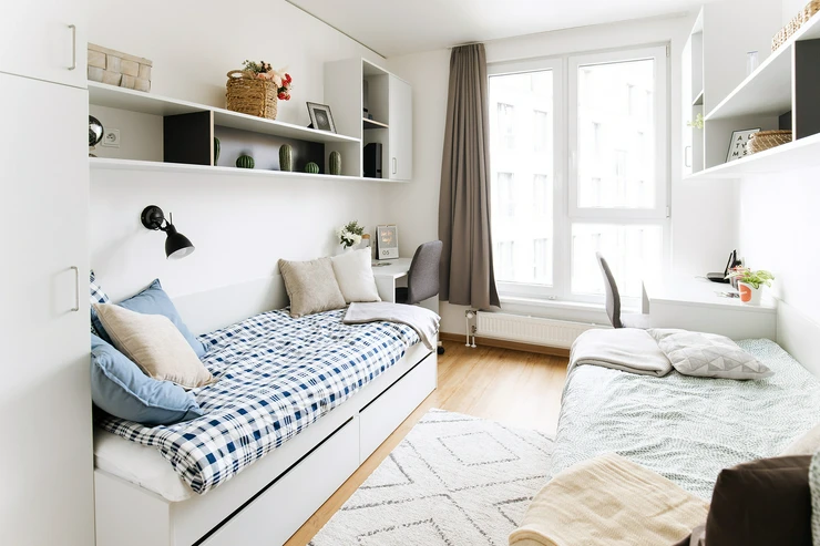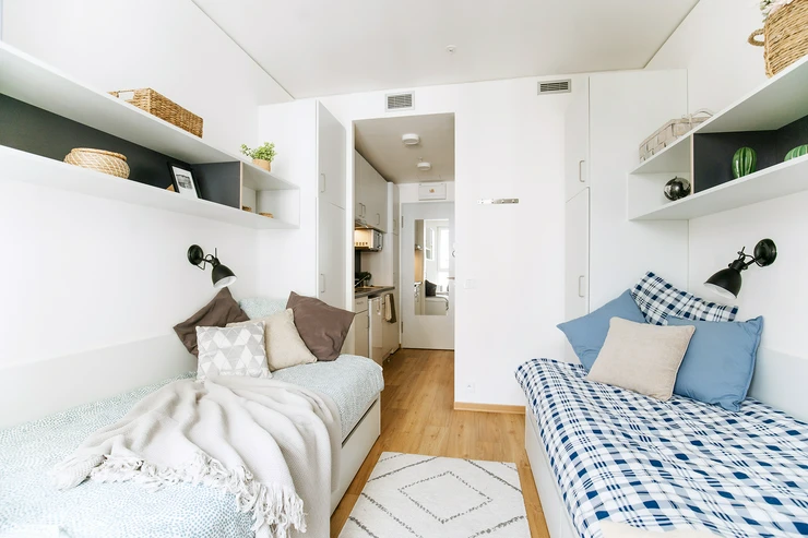 The apartment is suitable for two people. Each tenant has their own desk, bed, and wardrobe. The kitchenette and bathroom are shared. The listed price is per bed.