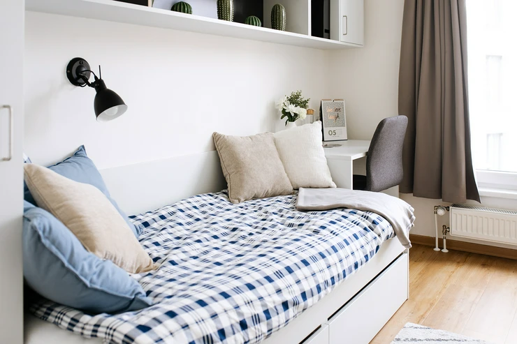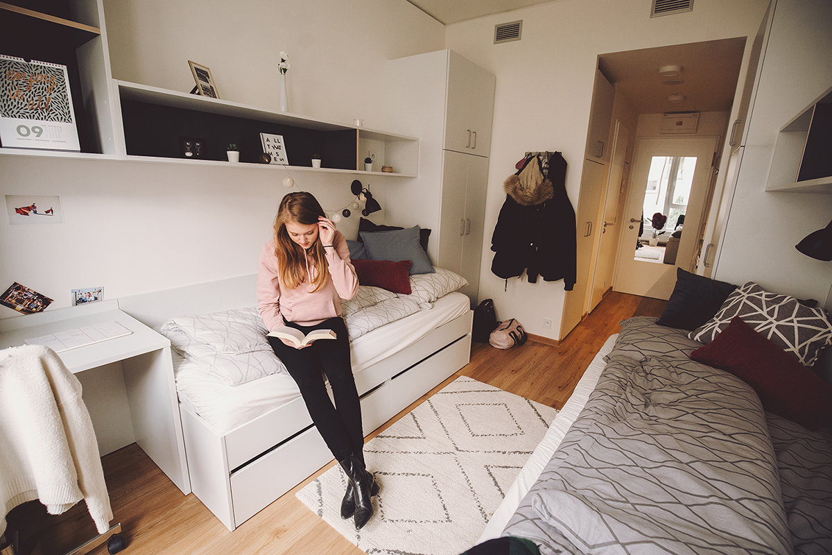 • Living and working area: bed incl. mattress, desk with chair, wardrobe, lightproof curtains, intercom and generally extra storage space