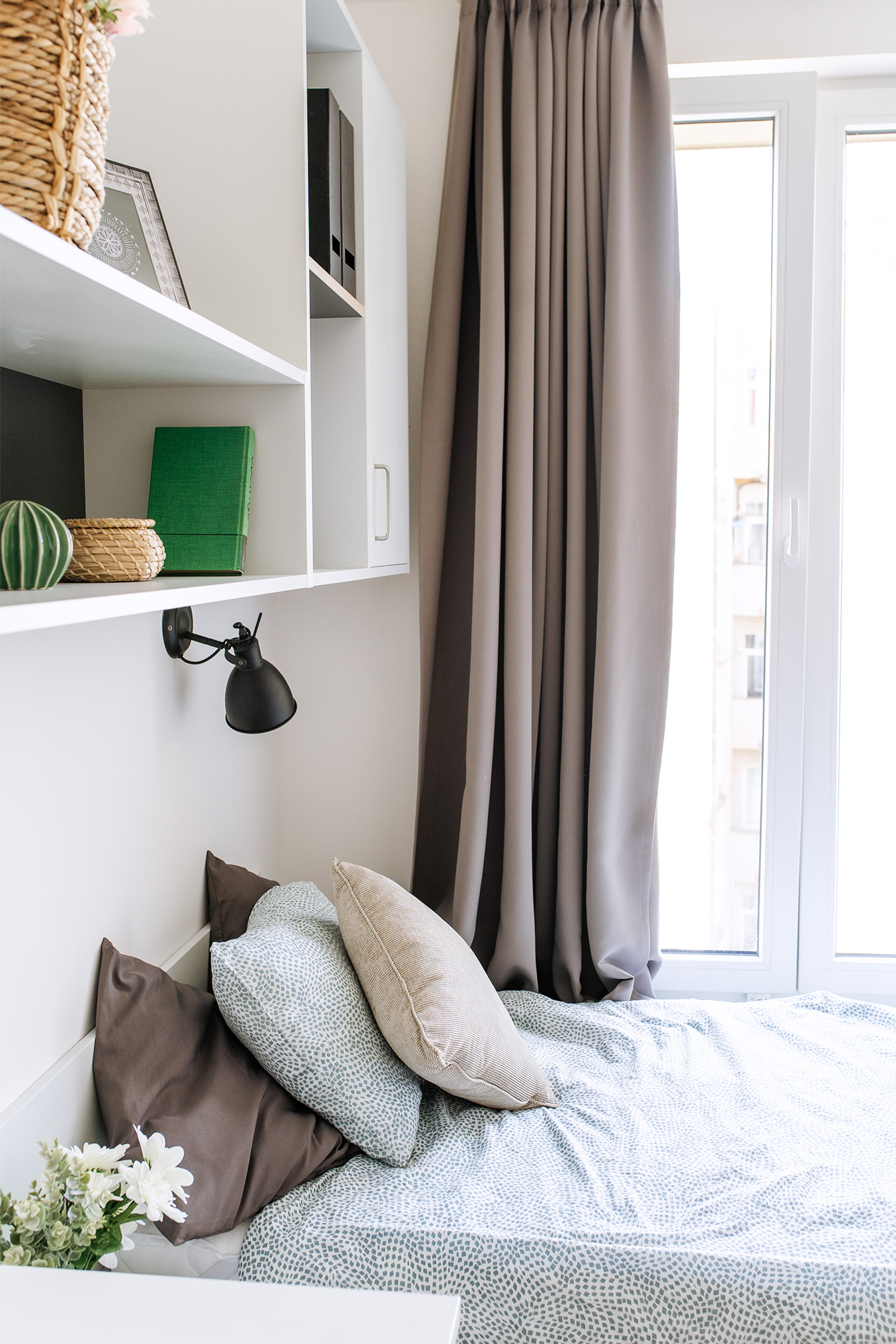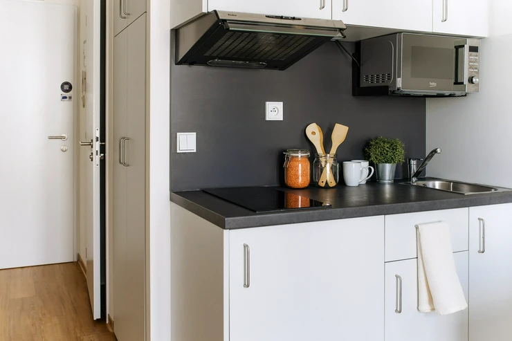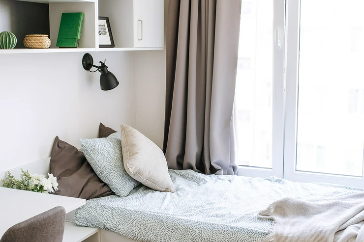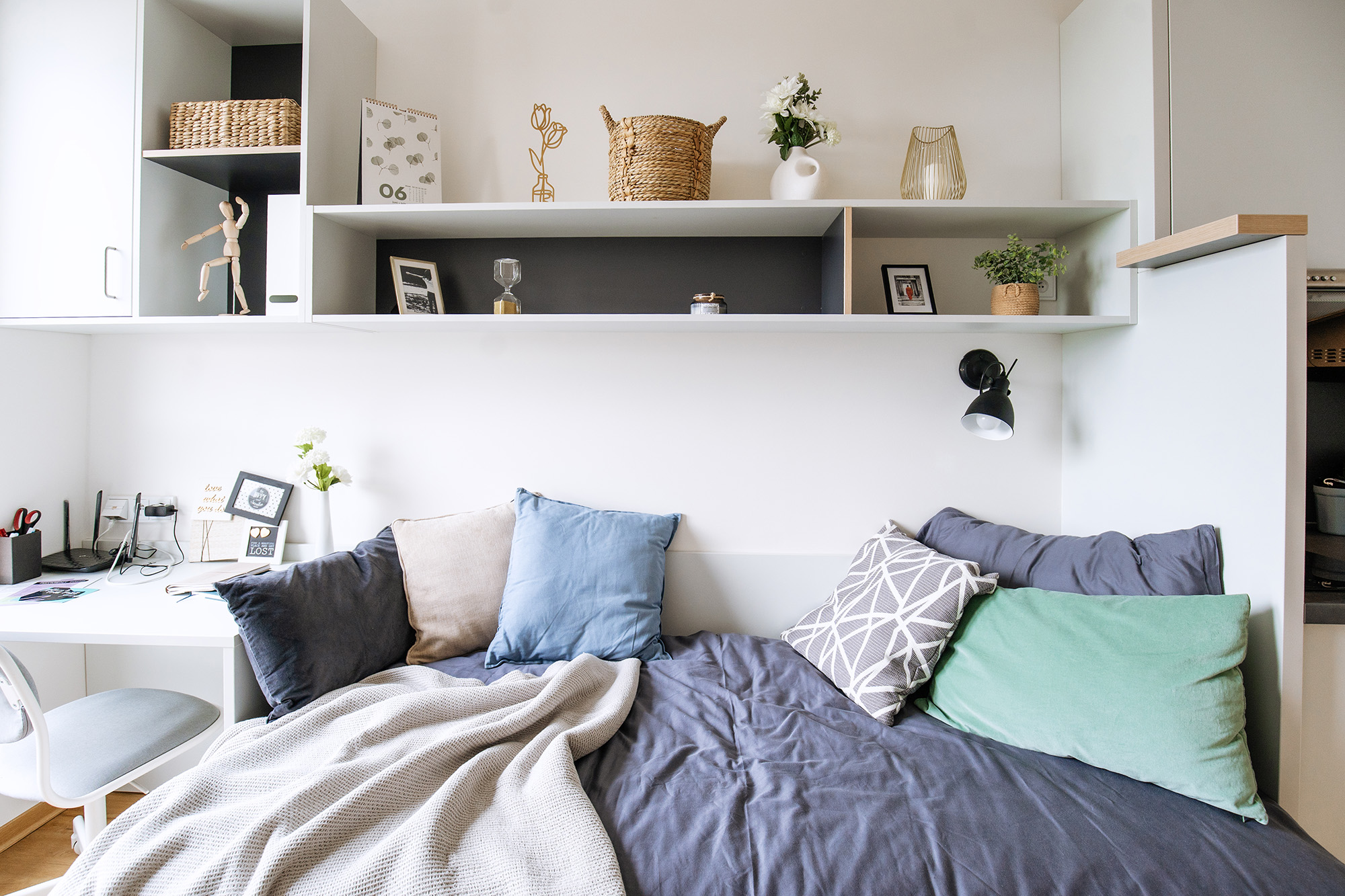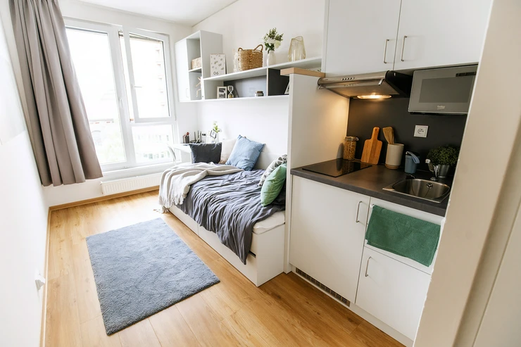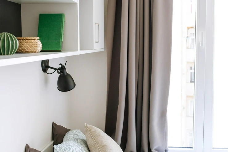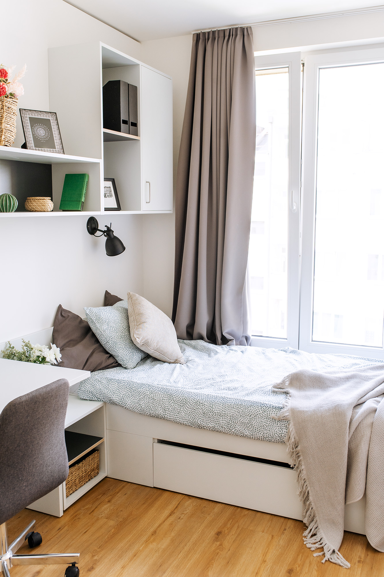 • Living and working area: bed incl. mattress, desk with chair, wardrobe, lightproof curtains, intercom and generally extra storage space