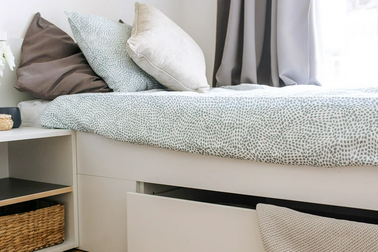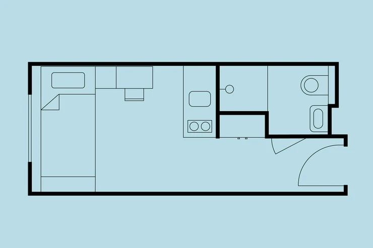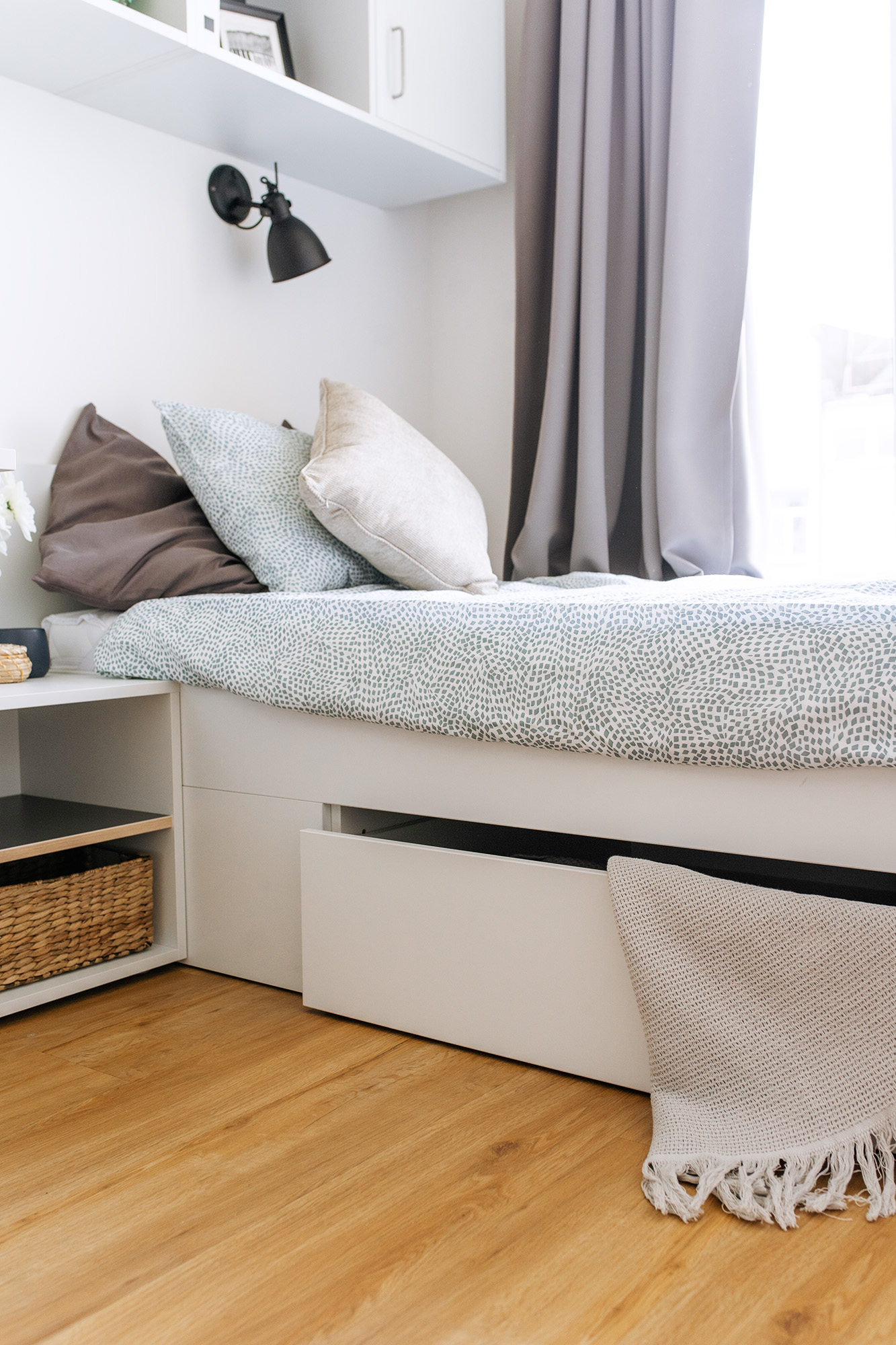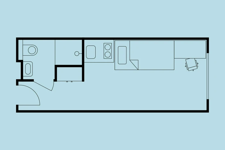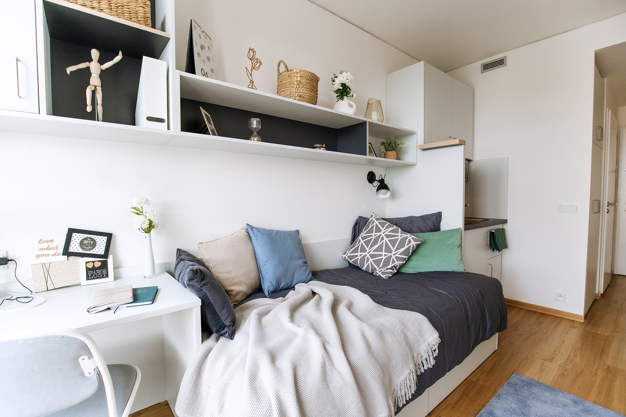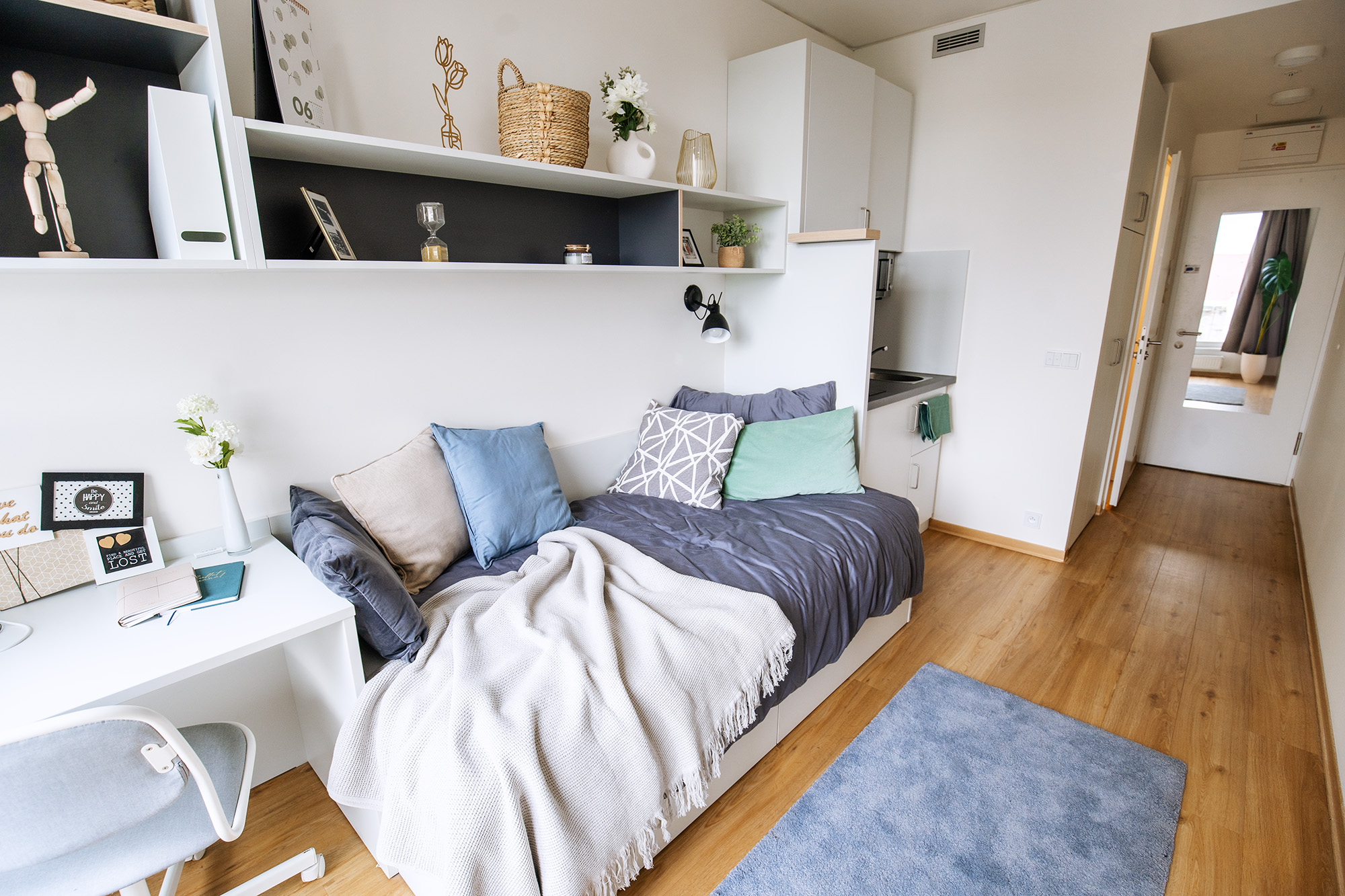 • Living and working area: bed incl. mattress, desk with chair, wardrobe, lightproof curtains, intercom and generally extra storage space