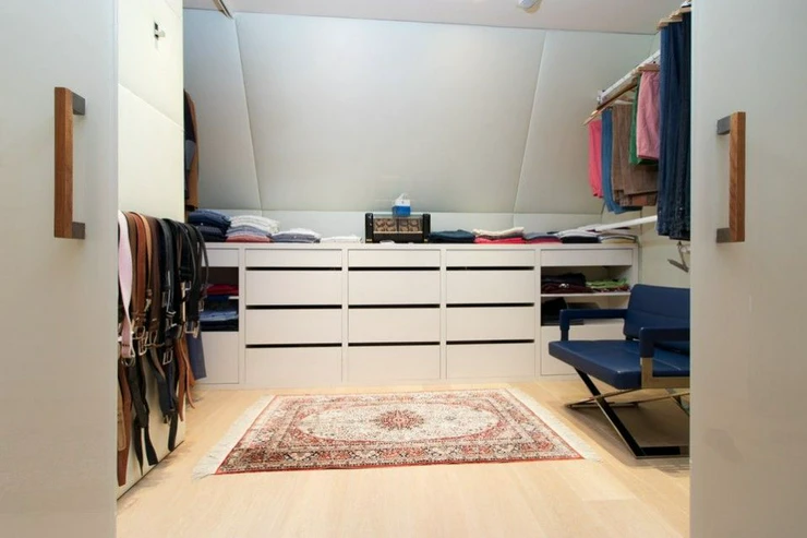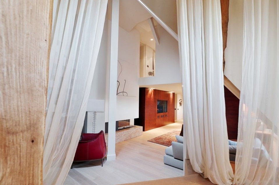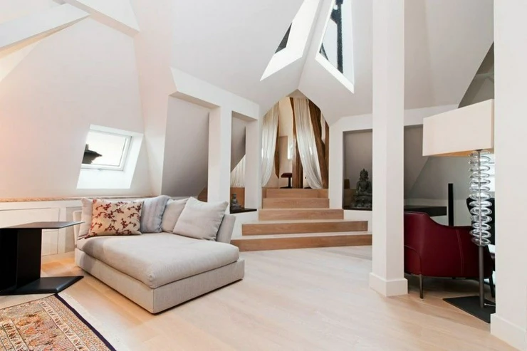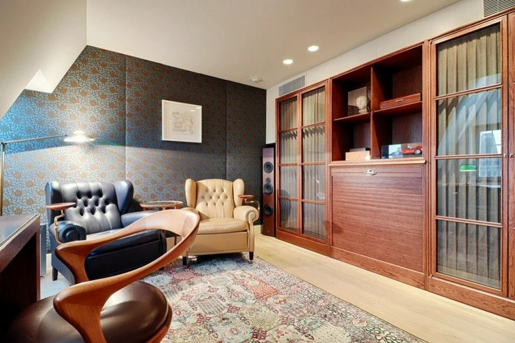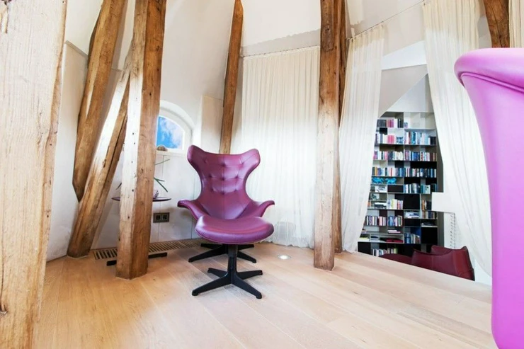 The layout of the quiet maisonette includes a spacious entrance hall, generous open space living room with kitchen, dining room with seating for 9 people, living area with fireplace, study and unique boudoir in the tower with preserved original beams, study, children's room, spacious dressing room, large bathroom, utility room, utility room, laundry, guest toilet, on the 2nd floor of the maisonette there is a rest area of the apartment, master bedroom with dream suit bathroom, 2 comfortable large dressing rooms (men's, women's)with a shower, jacuzzi and absolutely stunning views of the rooftops of old Prague and the Prague Castle panorama.