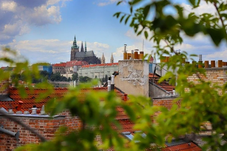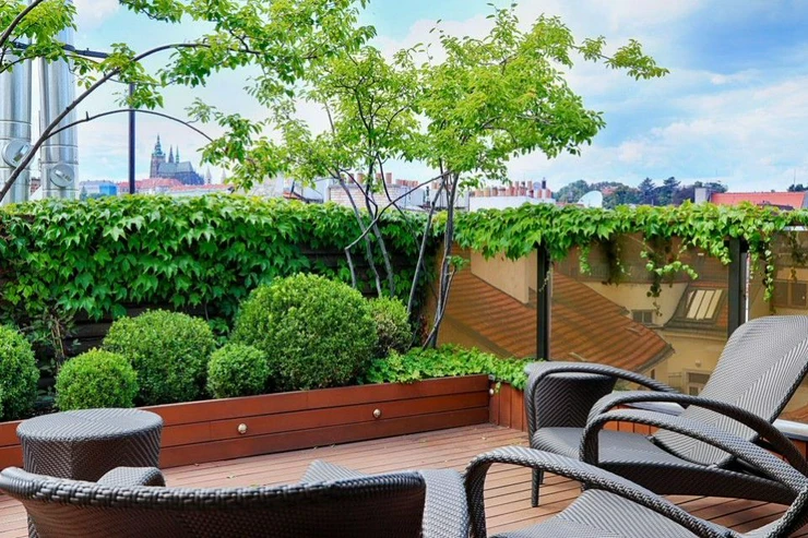 Exceptional duplex apartment 252m2 after a costly complete reconstruction with a unique terrace of 42.5m2 and unique views of the old town including a panoramic view of Prague Castle on the 6th floor of a refined apartment building with a lift at a prestigious address in the historic centre of Prague Vltava embankment, Old Town Square, National Theater or Charles Bridge and just one tram stop from Staroměstská metro station.