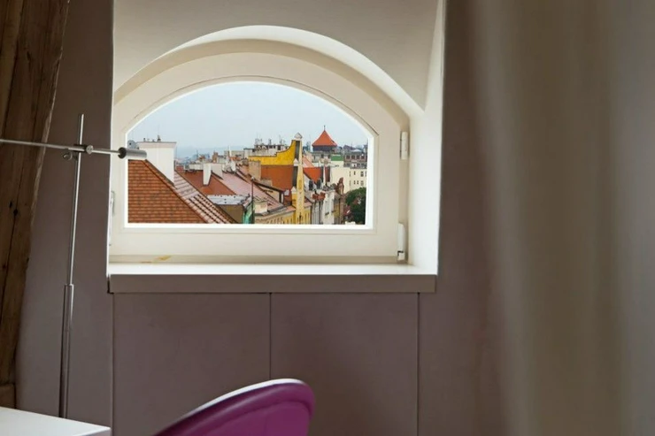 The interior of the upper floor consists of a living room, kitchen, 2 bedrooms, study, 2 bathrooms, separate toilet and hall. The lower floor consists of two study rooms, with a terrace with summer seating and unique, unique views of Prague Castle, en-suite bathroom and dressing room, storage room and gallery.