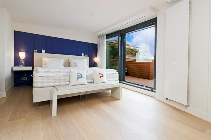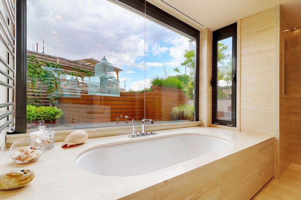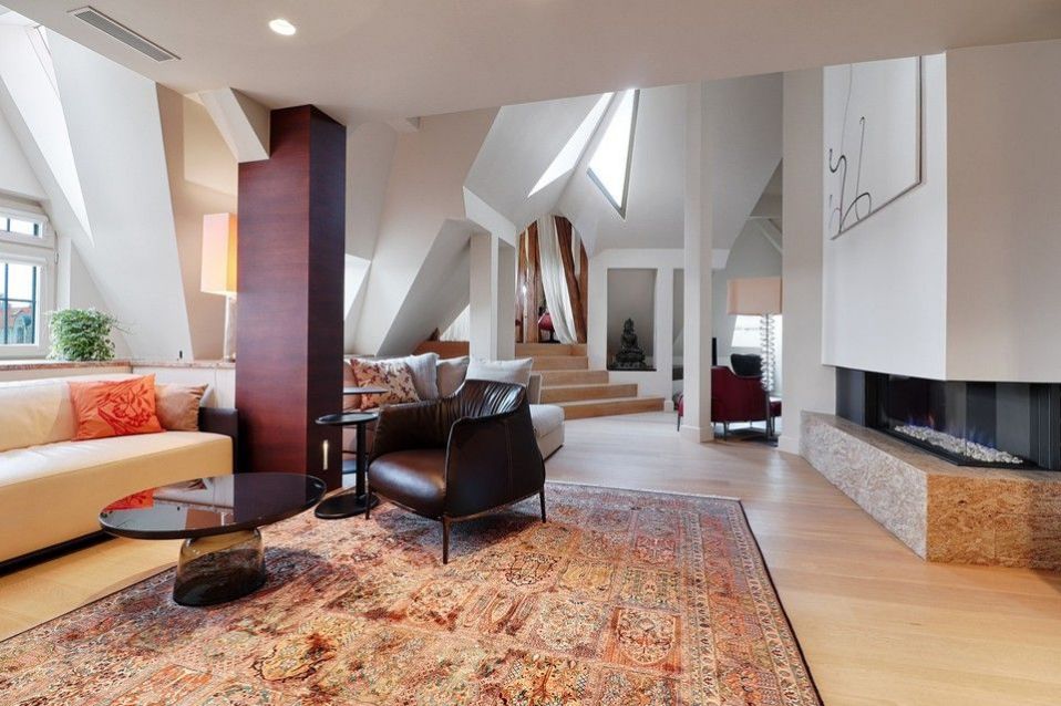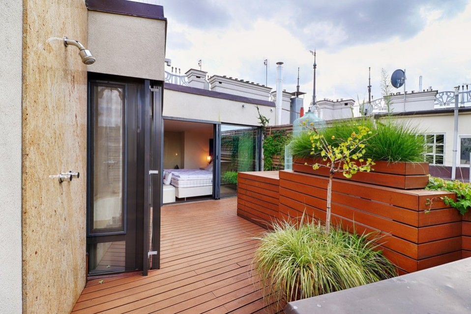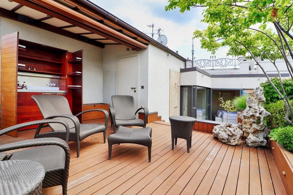 Expensive luxury equipment includes a white kitchen unit with an Italian marble top equipped with Miele appliances, induction, electric oven, 2 lounges, food storage, air conditioning throughout, dressing room micro-ventilation, solid wood floors, luxury gas fireplace, Antonio Lupi sanitary, BMI central control system, Italian Traventine lining, wooden wall lining, diamond safety glass, camera system, design lighting of various kinds, Murano glass lamps, security safe door with fire protection insert. The history of the building refers to a boudoir with original wooden beams located in a tower with fascinating views. Tiled wood terrace, presence of greenery according to landscape architect, whole terrace equipped with self-irrigation system with rain sensor, outdoor summer kitchen in stainless steel and wooden kitchen, shower, outdoor furniture DEDON. Electrically extensible awning with rain and wind sensor. The principles of Feng Shuej throughout the concept of the apartment. Intelligent home system, security window foil and security blinds of the highest category.