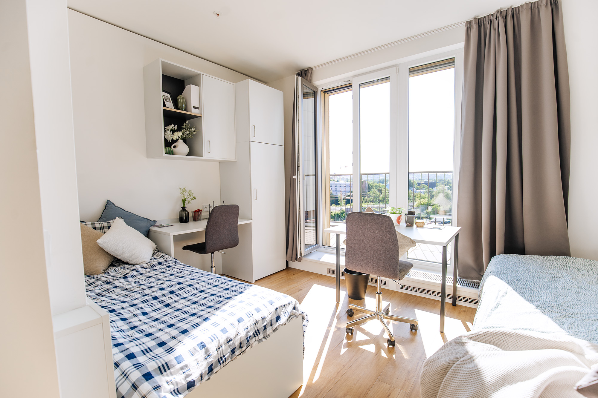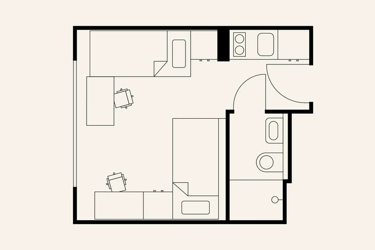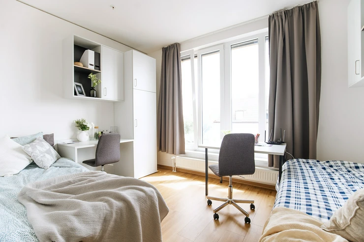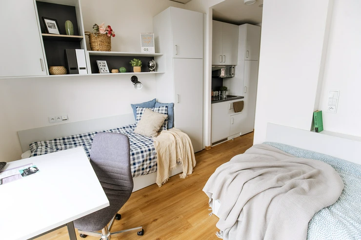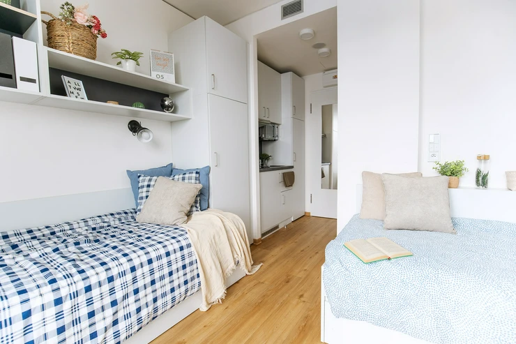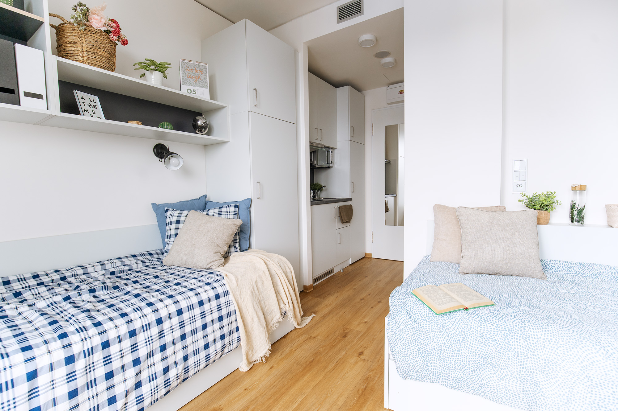 The apartment is suitable for two people. Each tenant has their own desk, bed, and wardrobe. The kitchenette and bathroom are shared. The listed price is per bed.