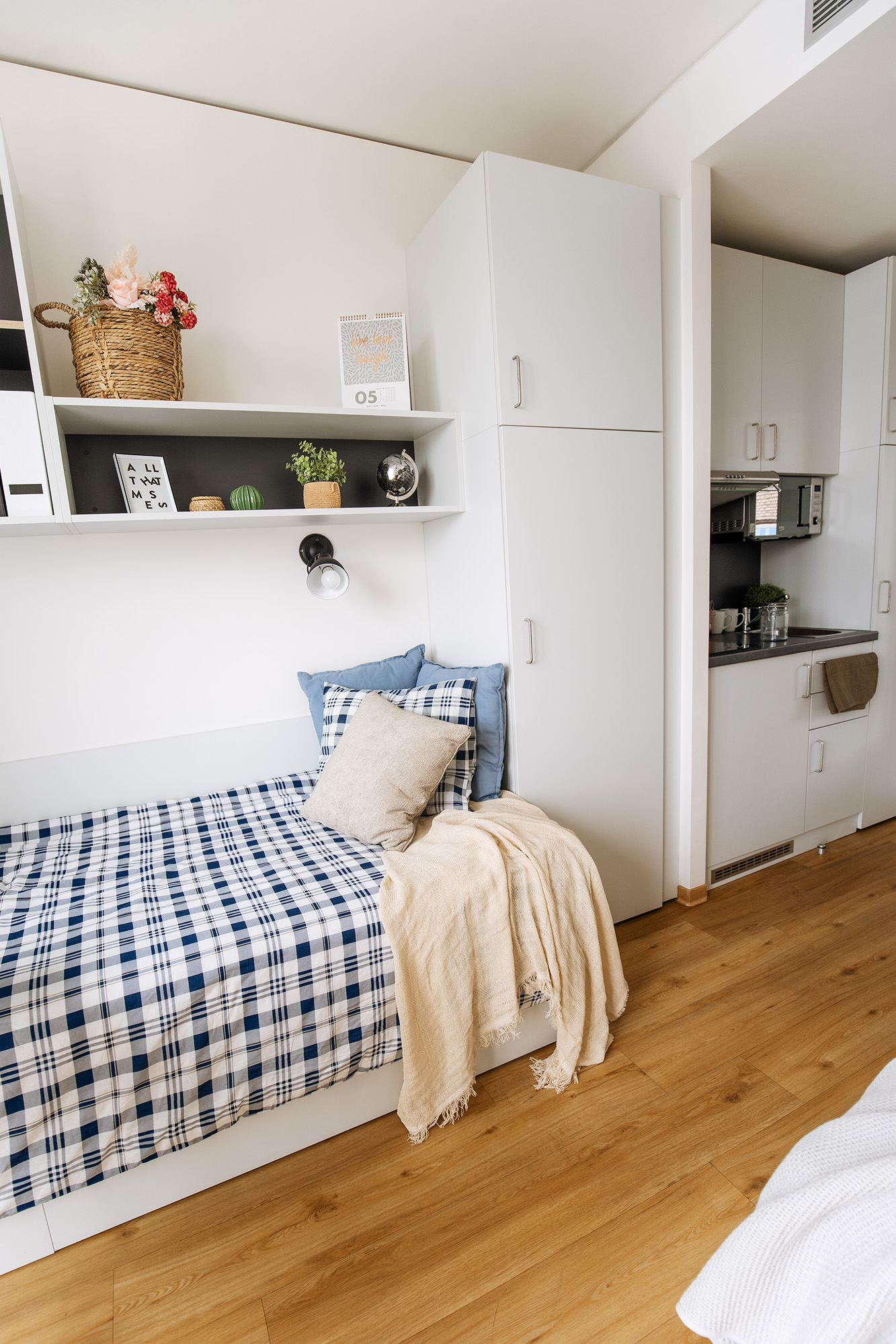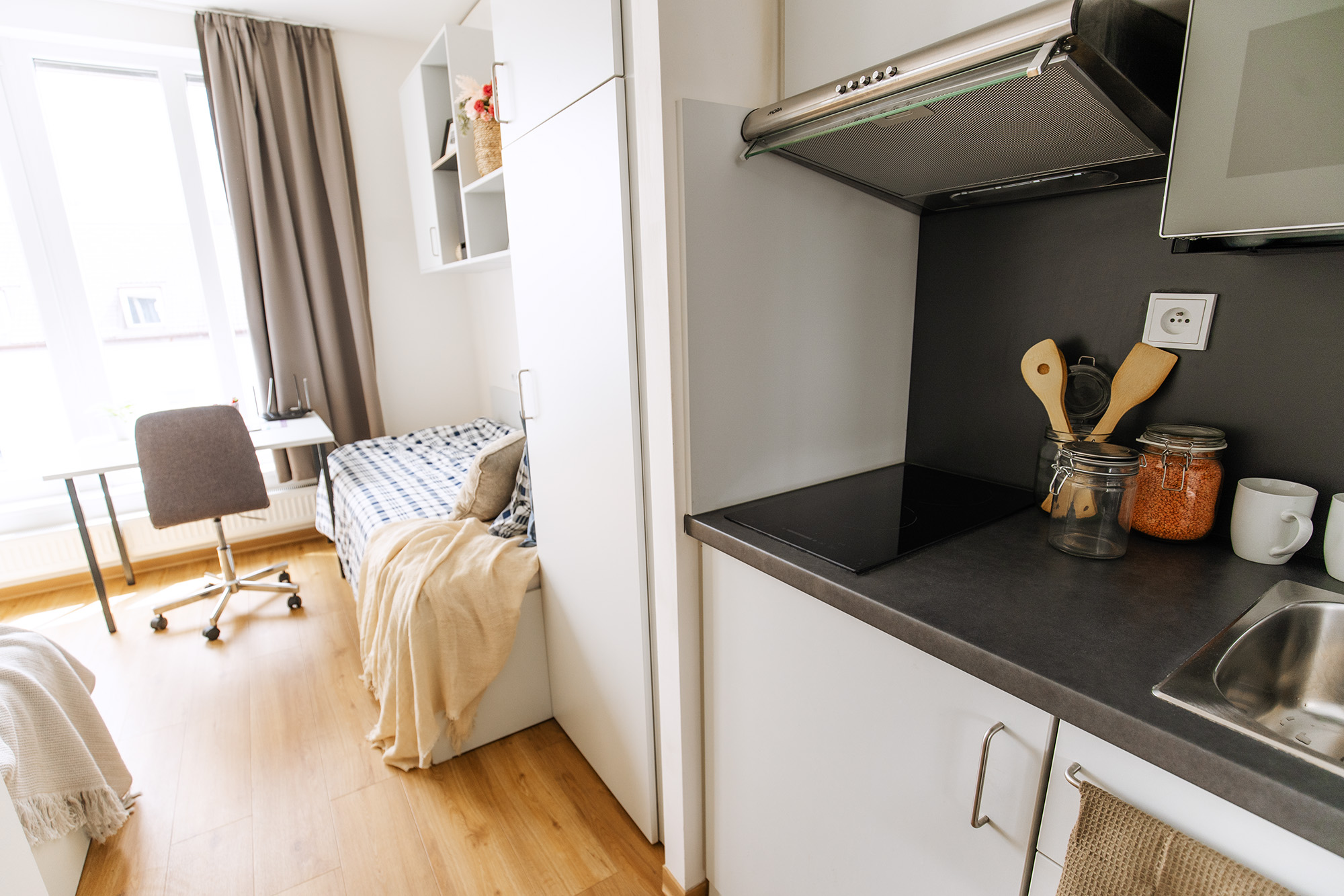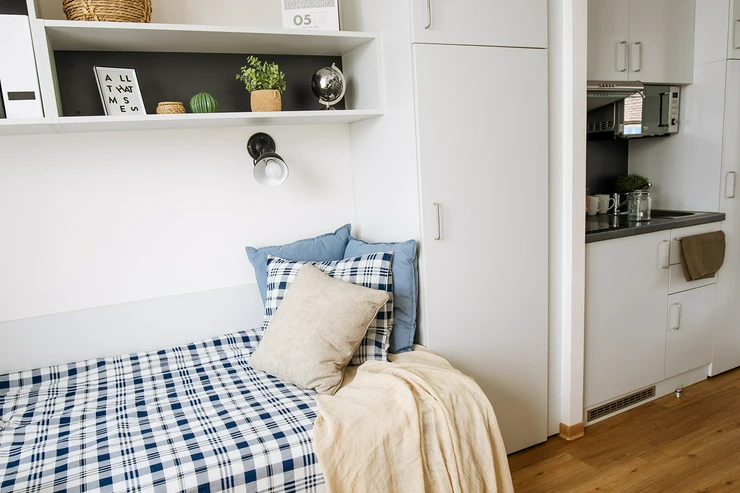 The apartment is suitable for two people. Each tenant has their own desk, bed, and wardrobe. The kitchenette and bathroom are shared. The listed price is per bed.