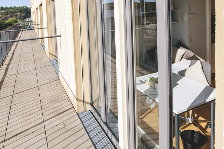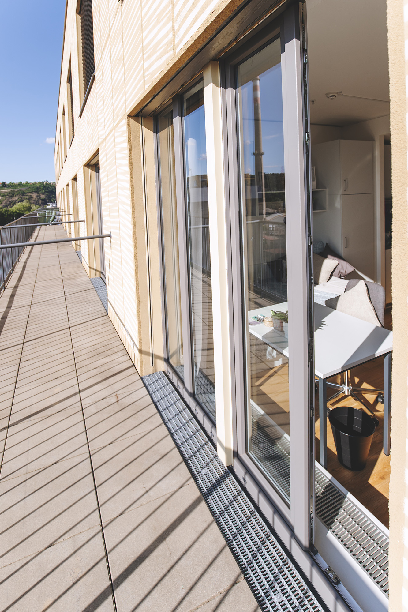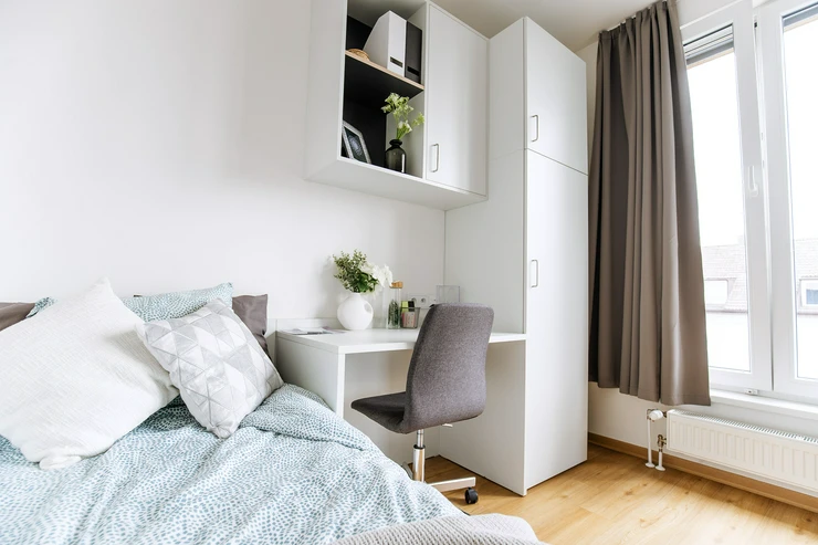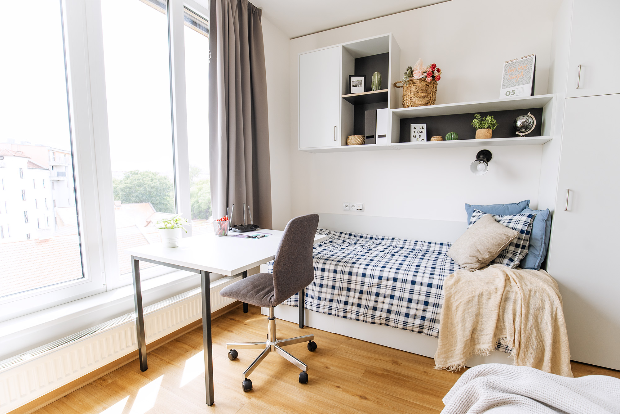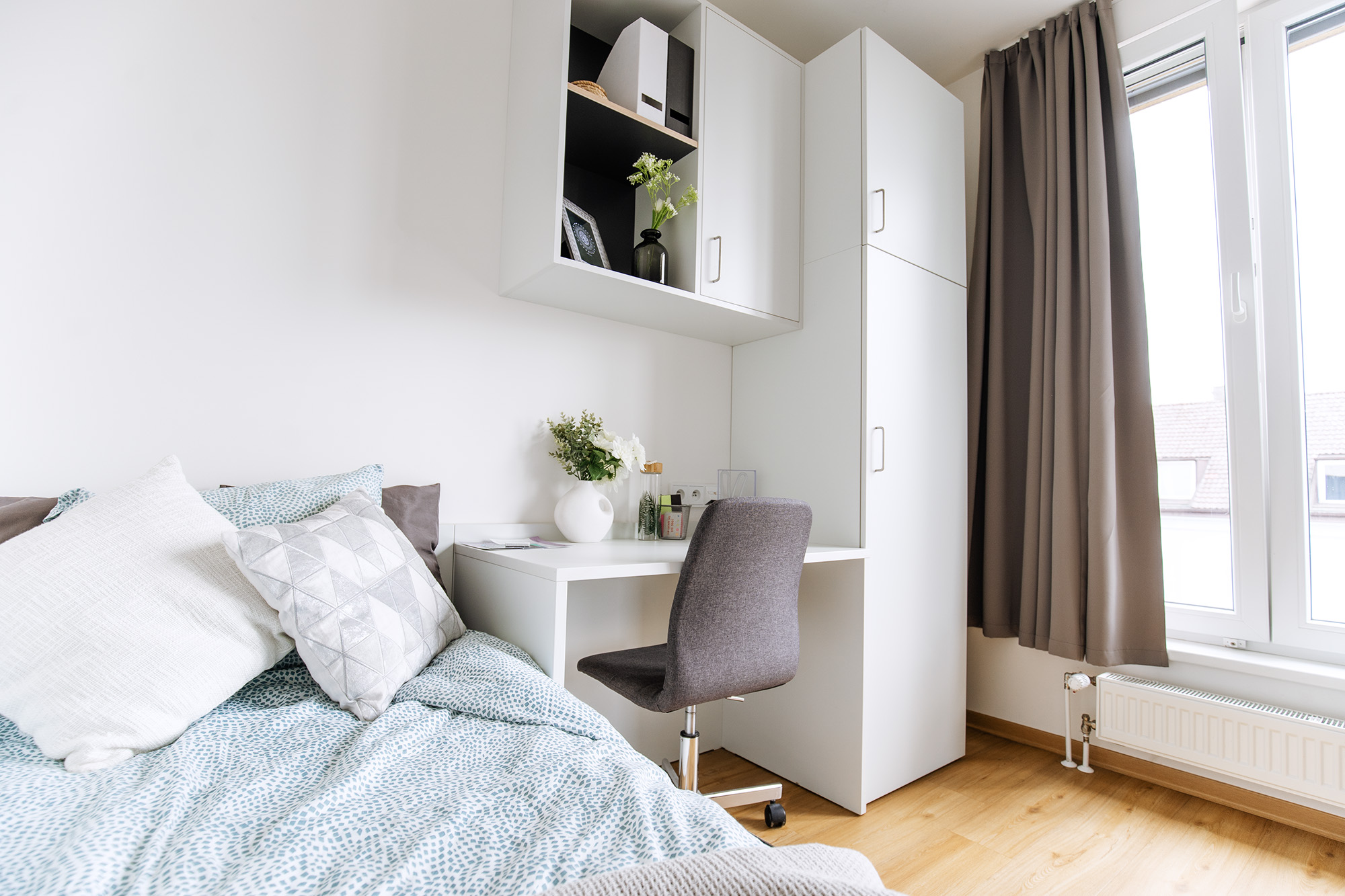 • Living and working area: bed incl. mattress, desk with chair, wardrobe, lightproof curtains, intercom and generally extra storage space