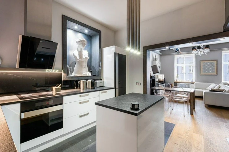 The interior of the 2+1 apartment consists of a spacious living room, a fully equipped modern kitchen, a bedroom with a loft, a dressing room, a bathroom with a shower, toilet and bidet, an entrance hall with built-in wardrobes.